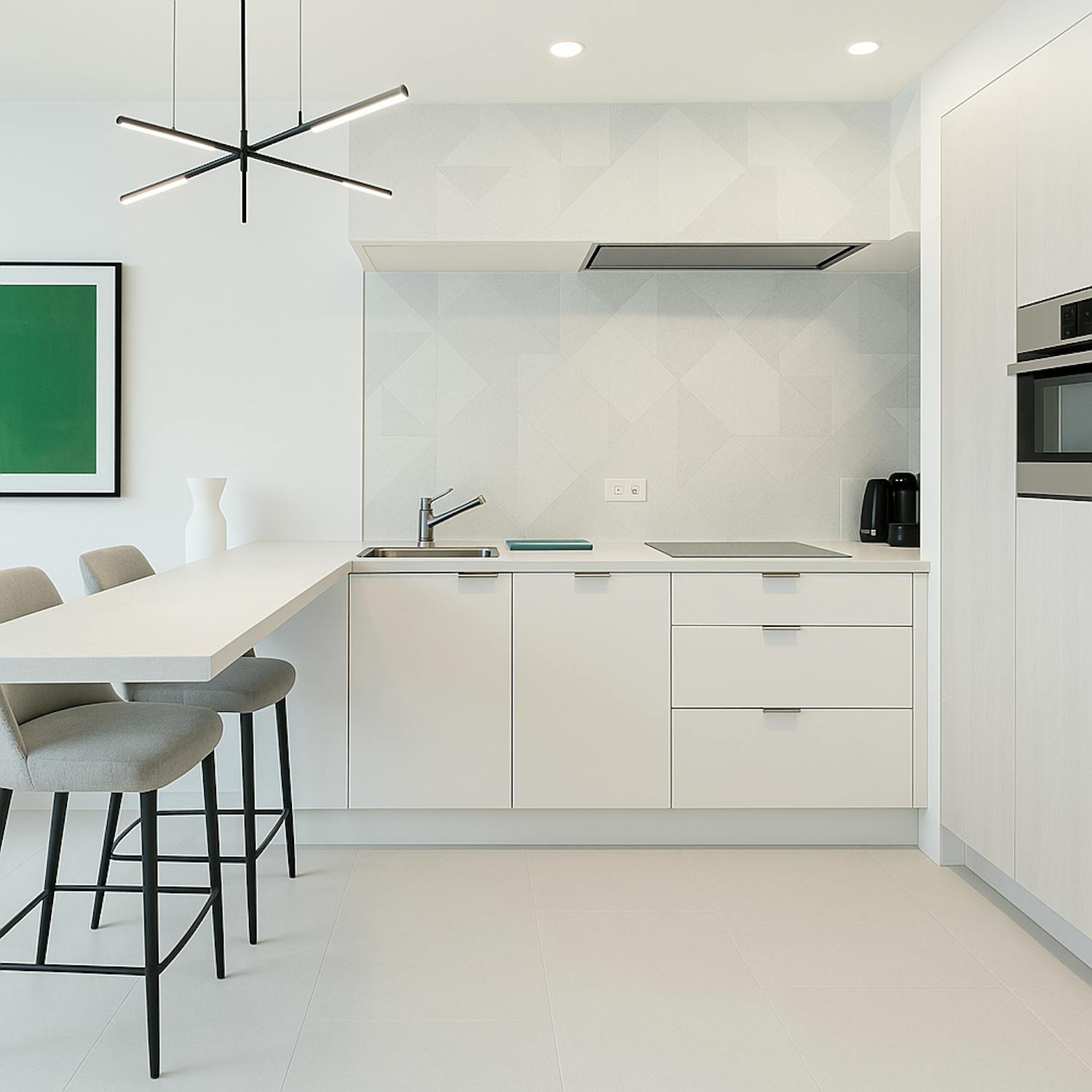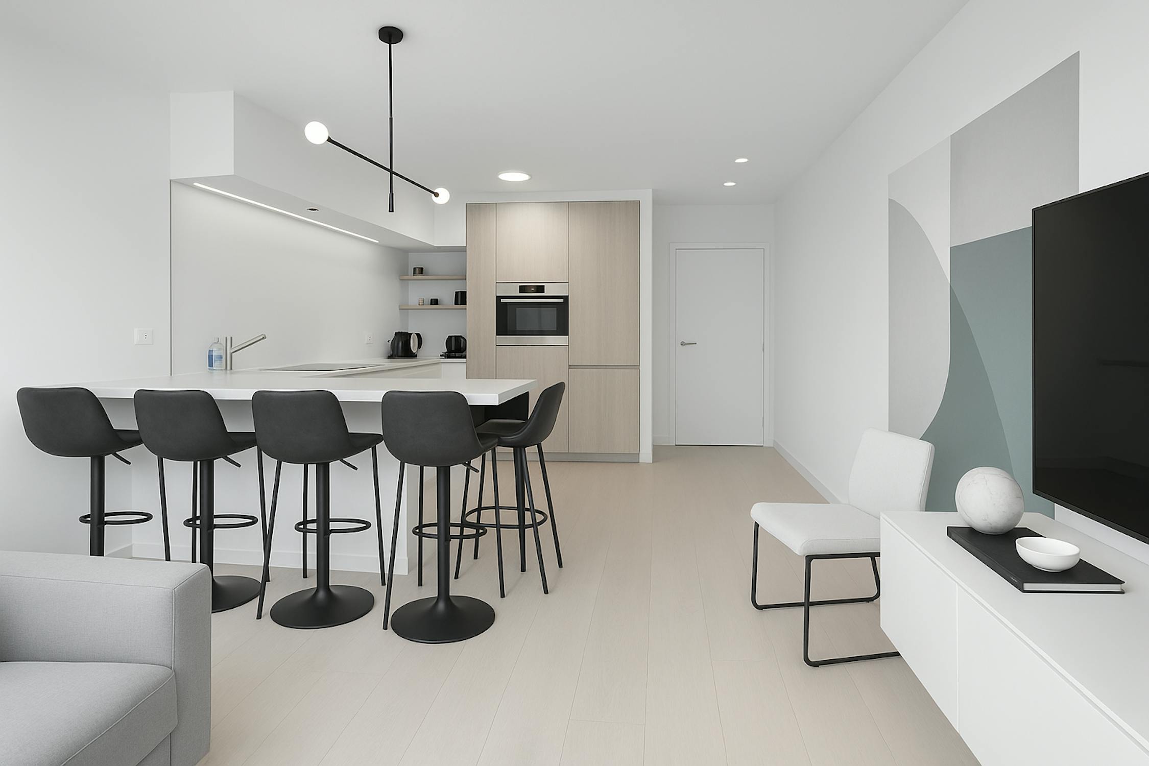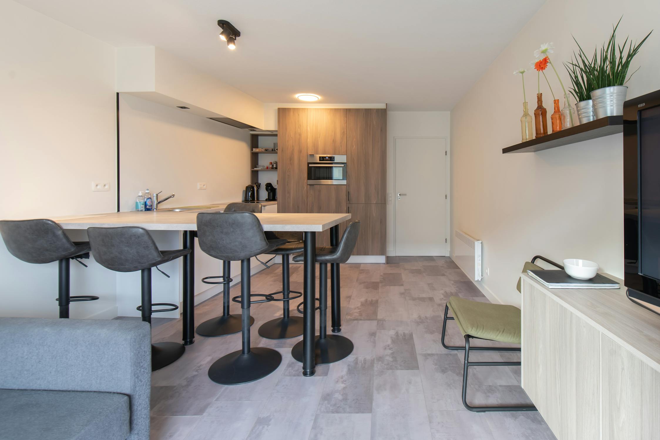 - open geïnstalleerde keuken voorzien van alle comfort (spoeltafel, vaatwas, ruime frigo, afzonderlijke diepvries, combioven en inductie kookplaat)