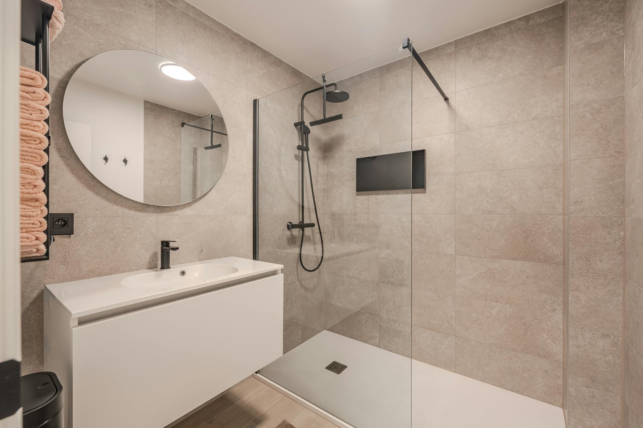 - Badkamer met lavabo en ruime douche