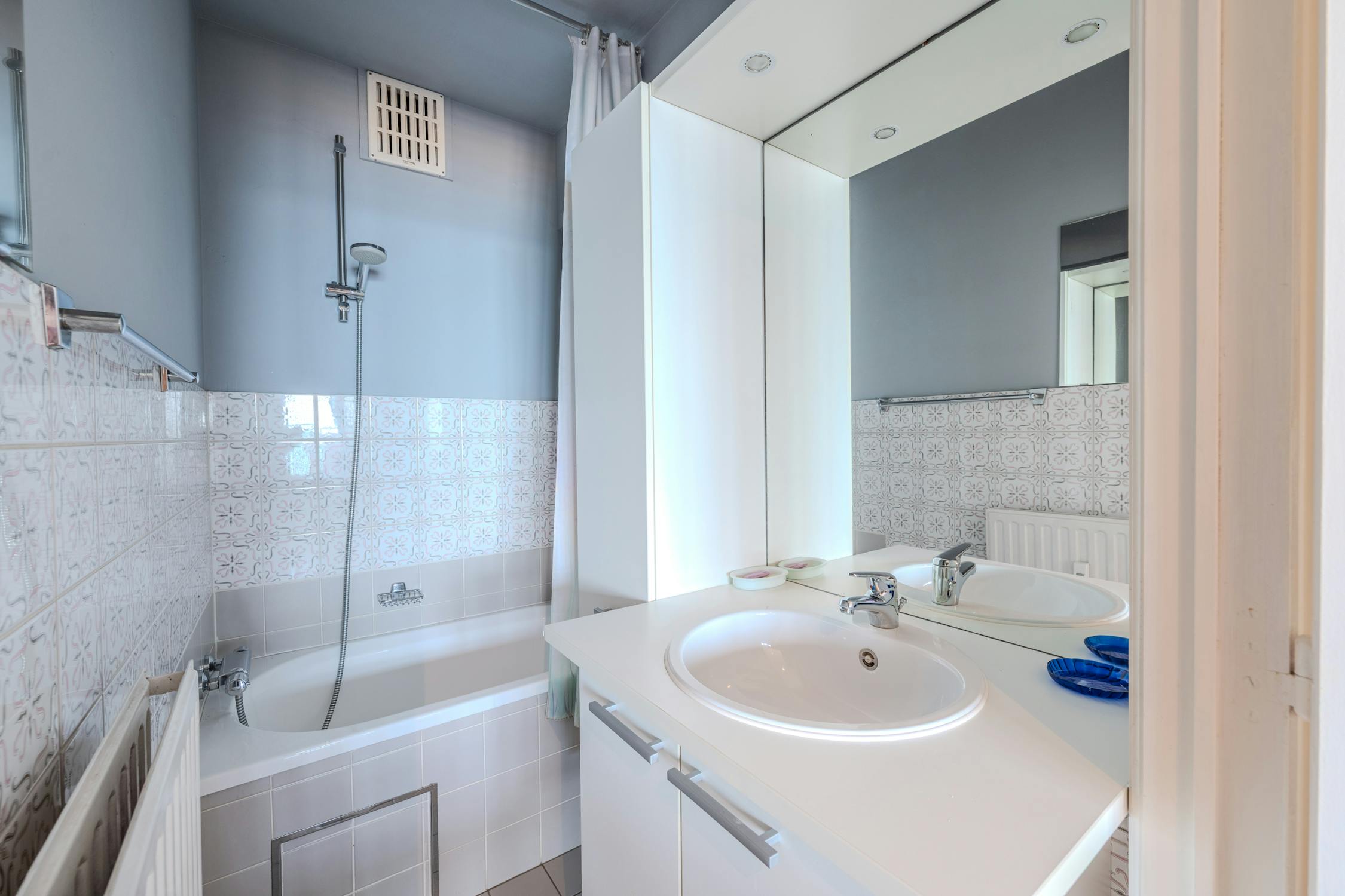 - badkamer voorzien van ligbad met douchescherm en badkamermeubel