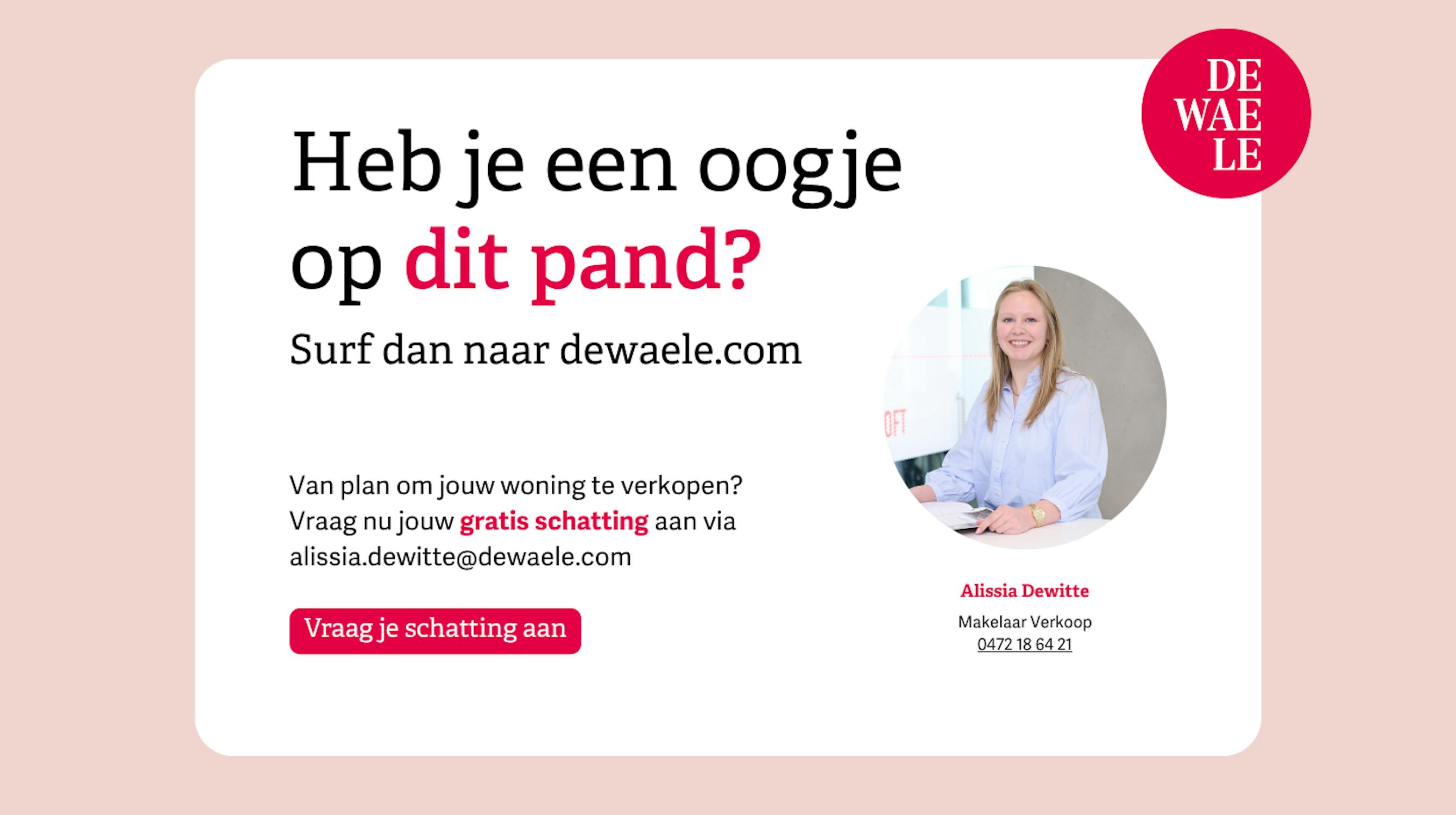 Wenst u meer info over deze woning of wenst u een bezoek ter plaatse? Contacteer Alissia Dewitte (0472 18 64 21 - alissia.dewitte@dewaele.com) of Yoshi Vandeginste (0474 49 50 38 - yoshi.vandeginste@dewaele.com)