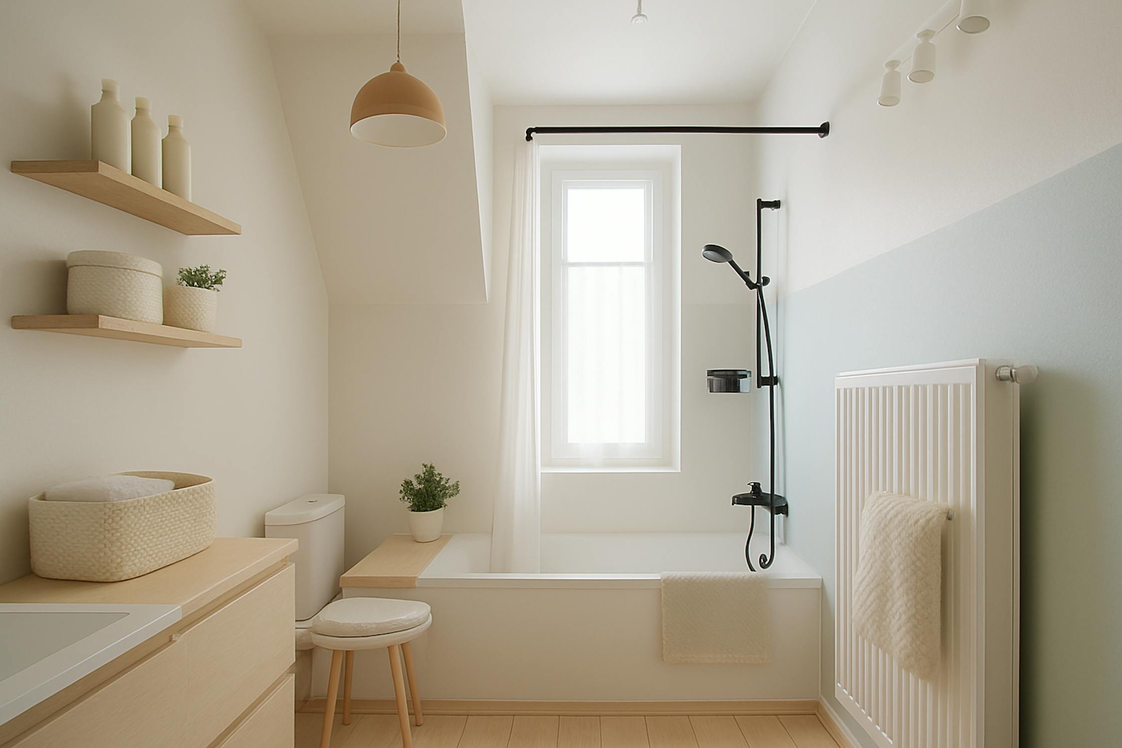 - badkamer uitgerust met toilet, ligbad/douche en lavabomeubel