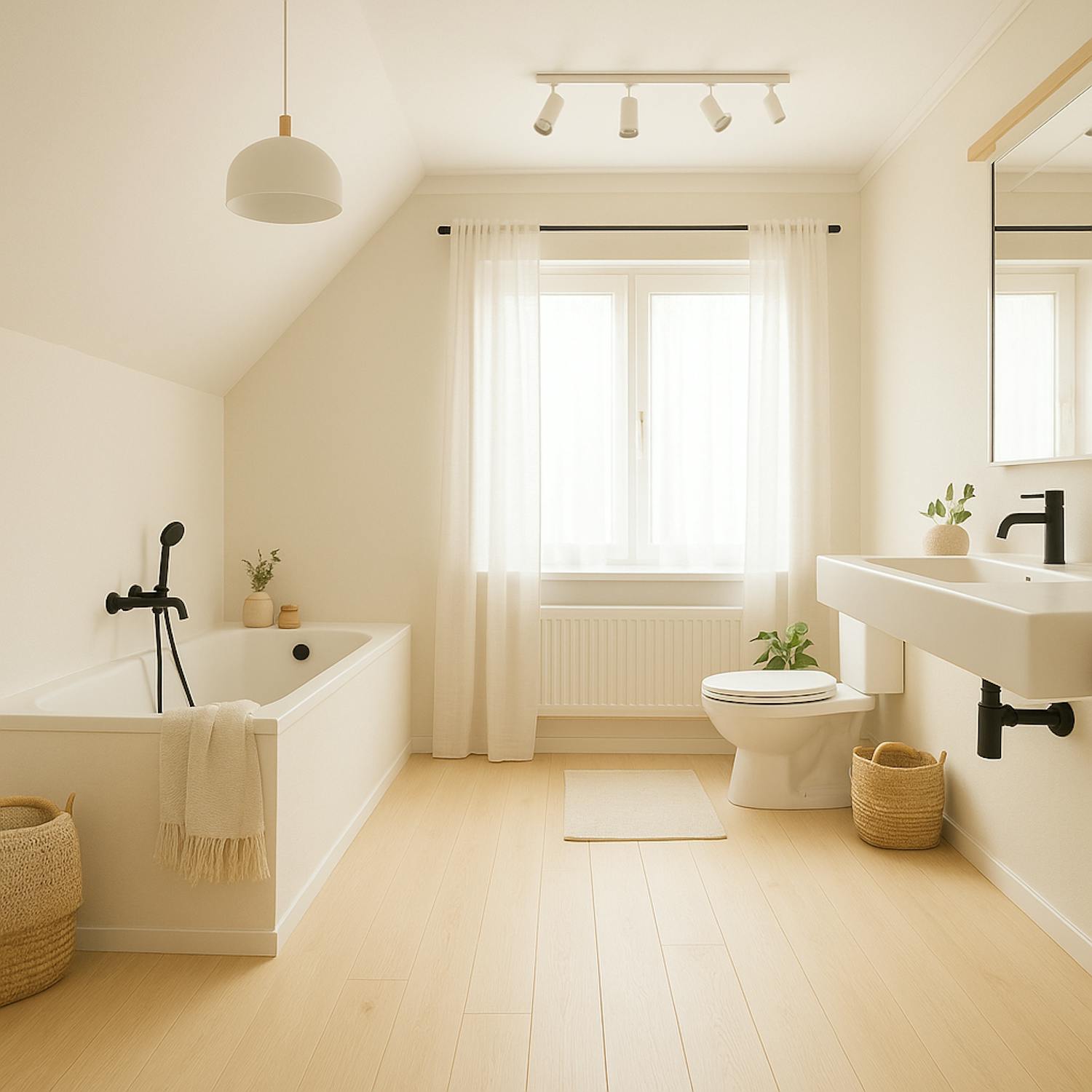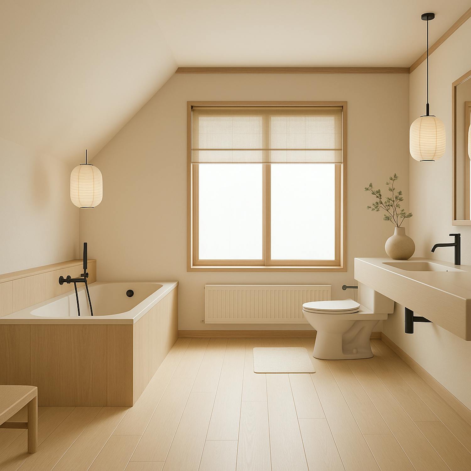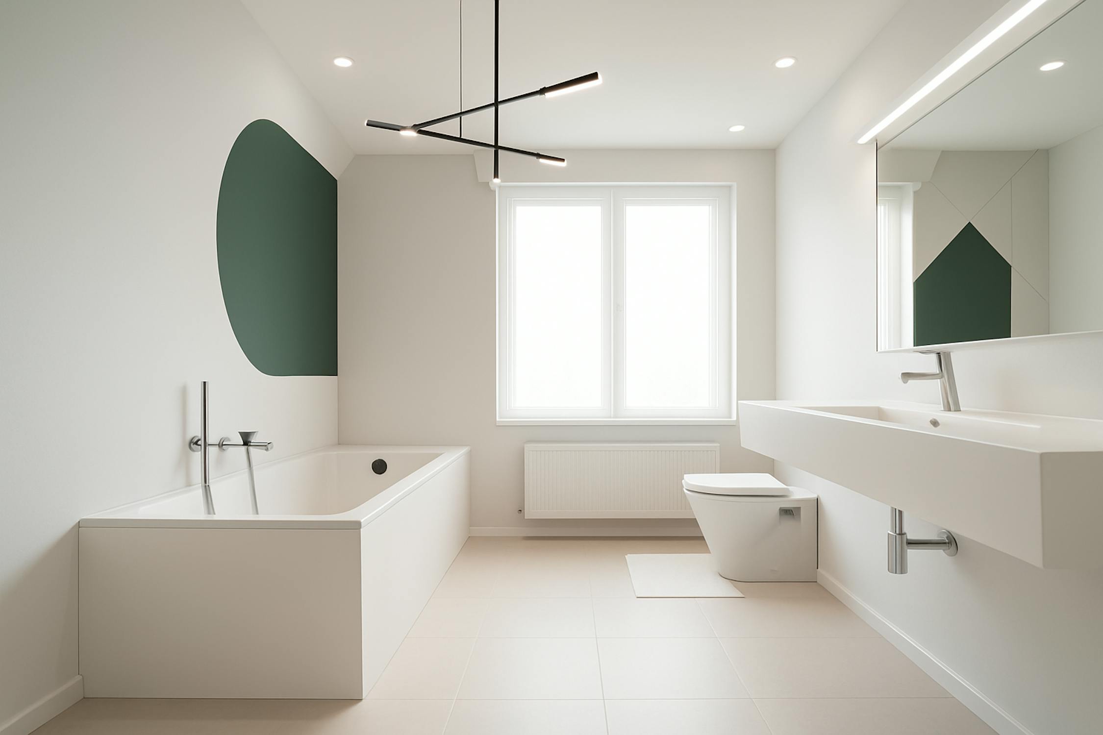 - Badkamer met lavabomeubel, ligbad en toilet