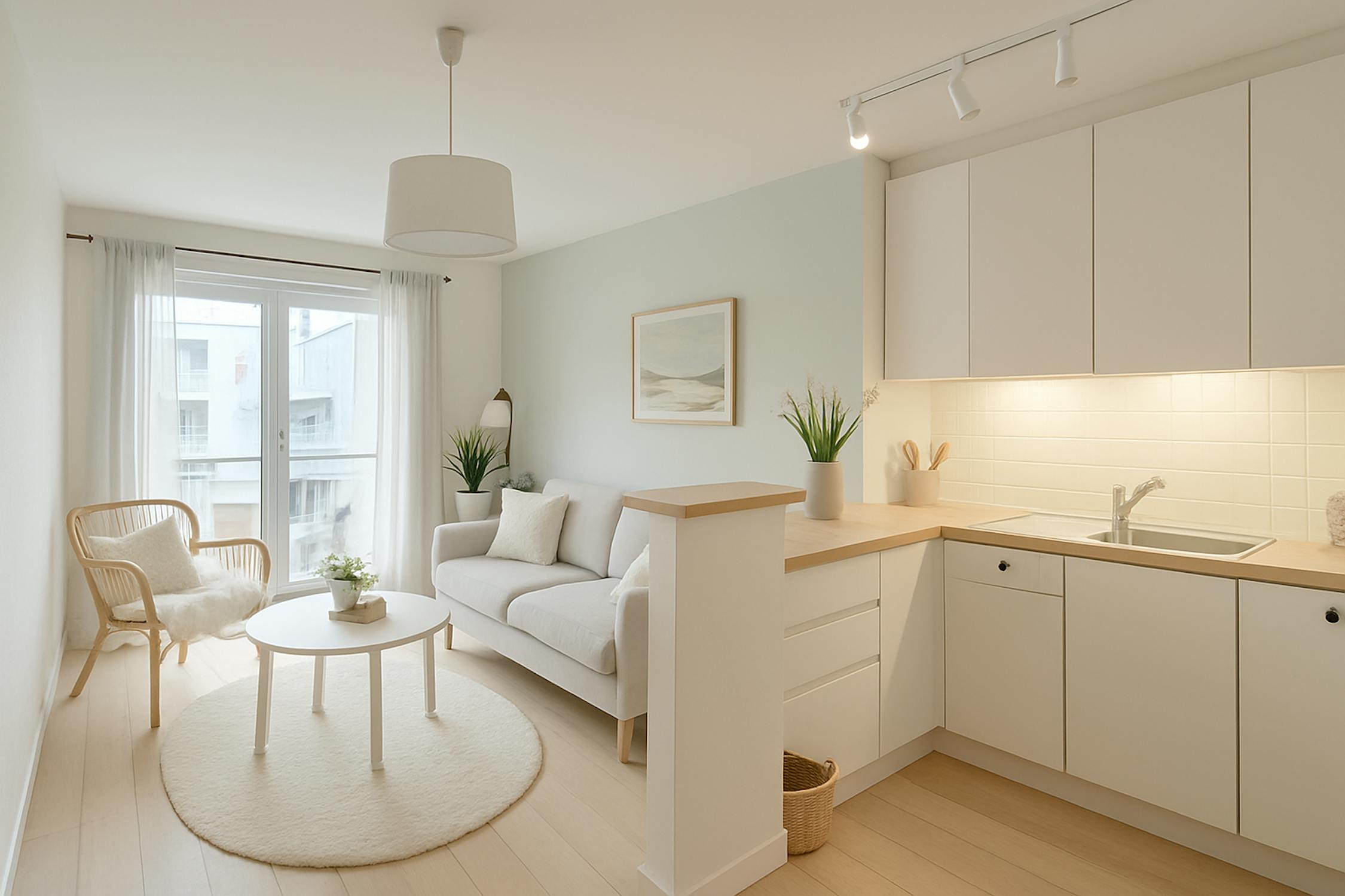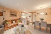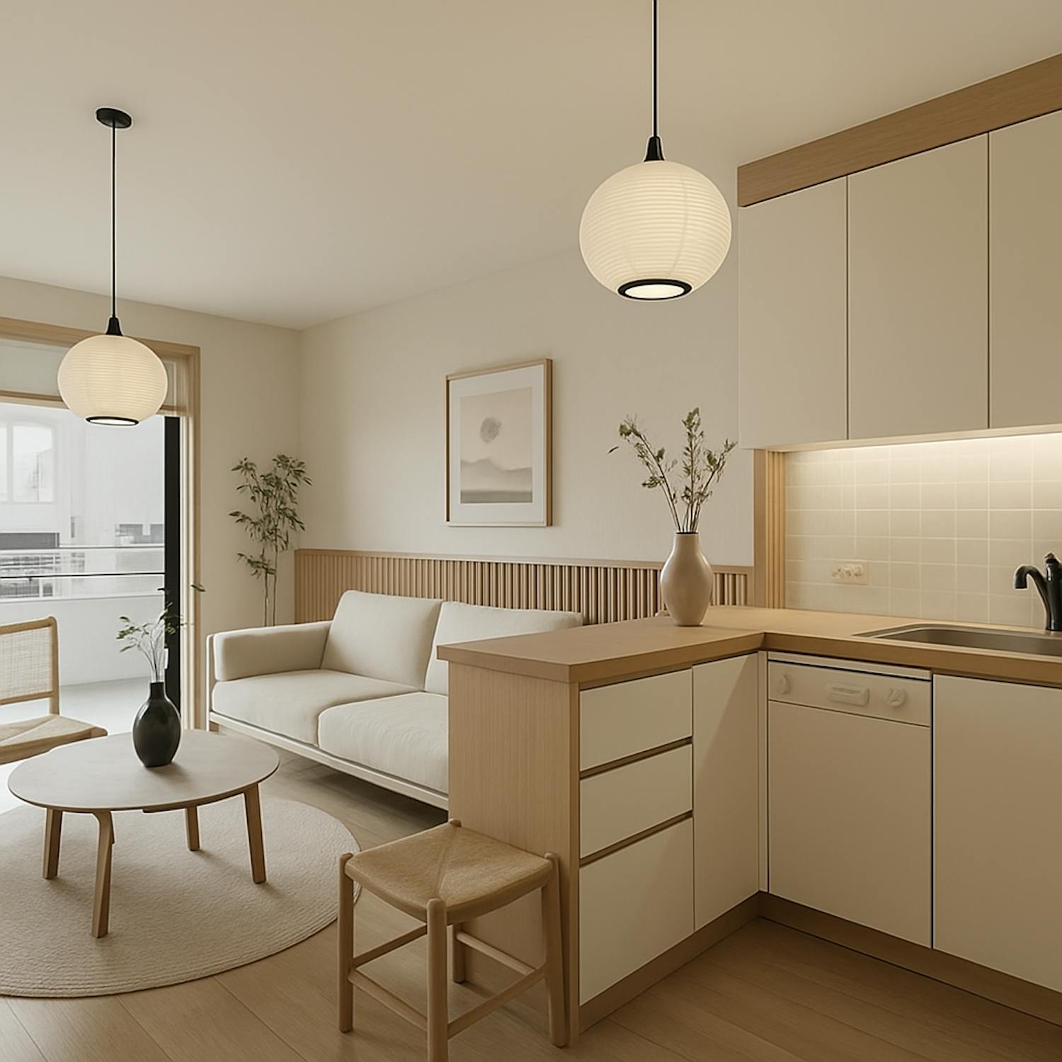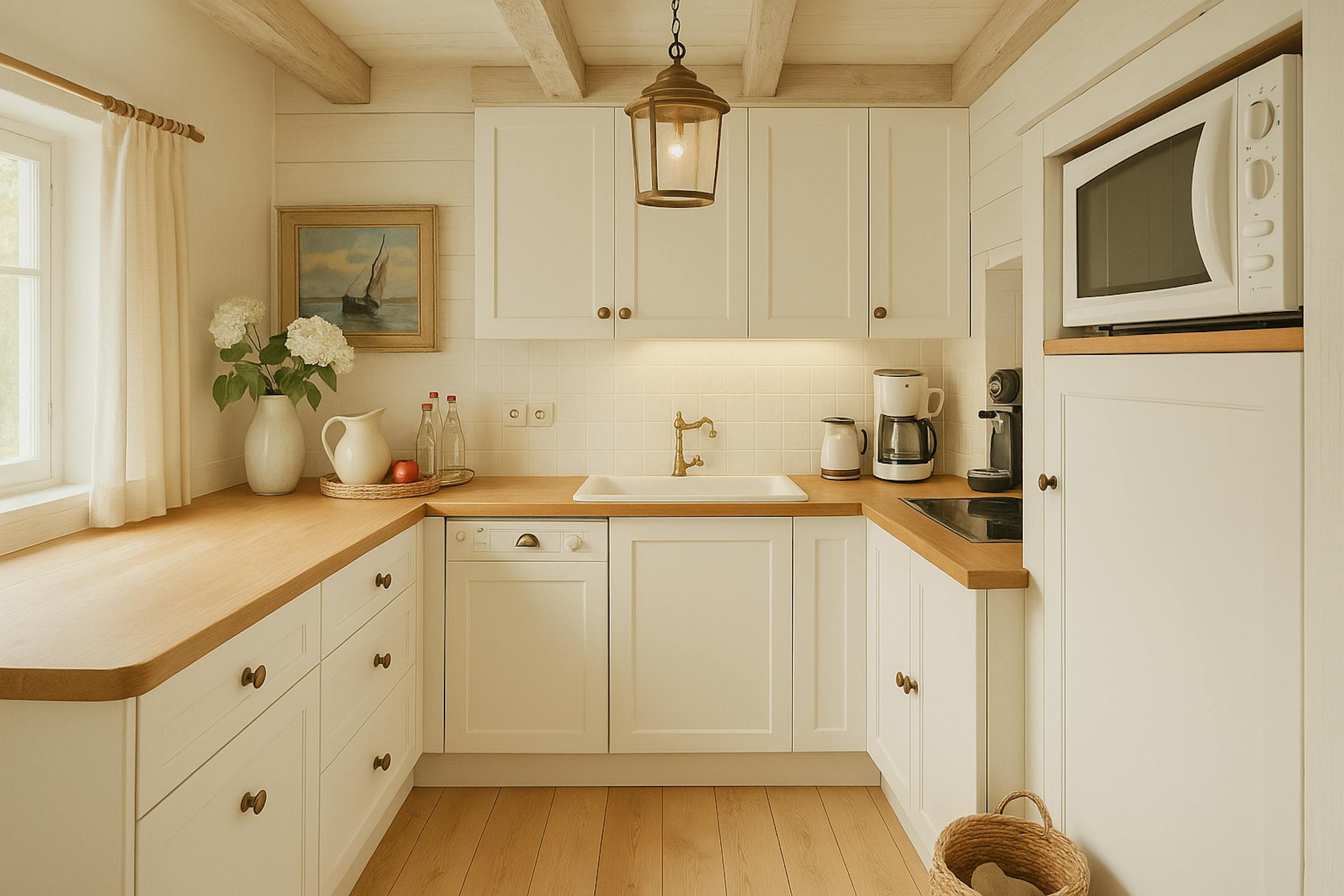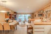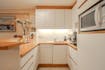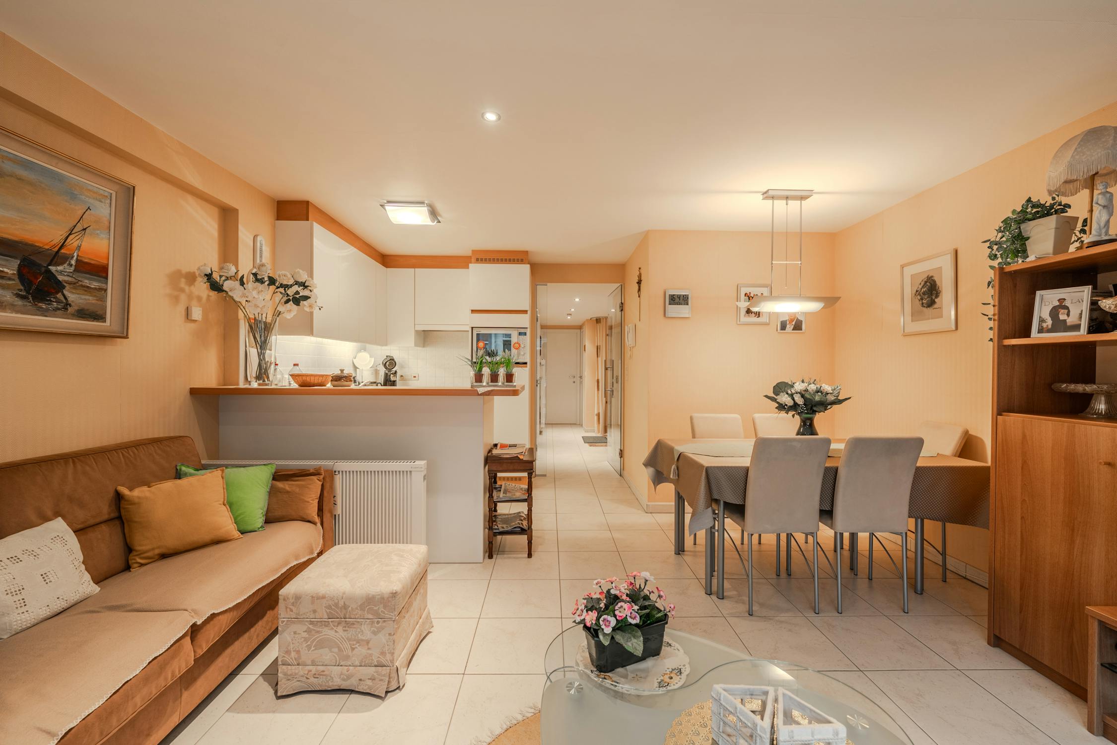- woonkamer (24m²) met open keuken voorzien van koelkast met diepvriesvakje, vaatwas, elektrische kookplaat en microgolfoven