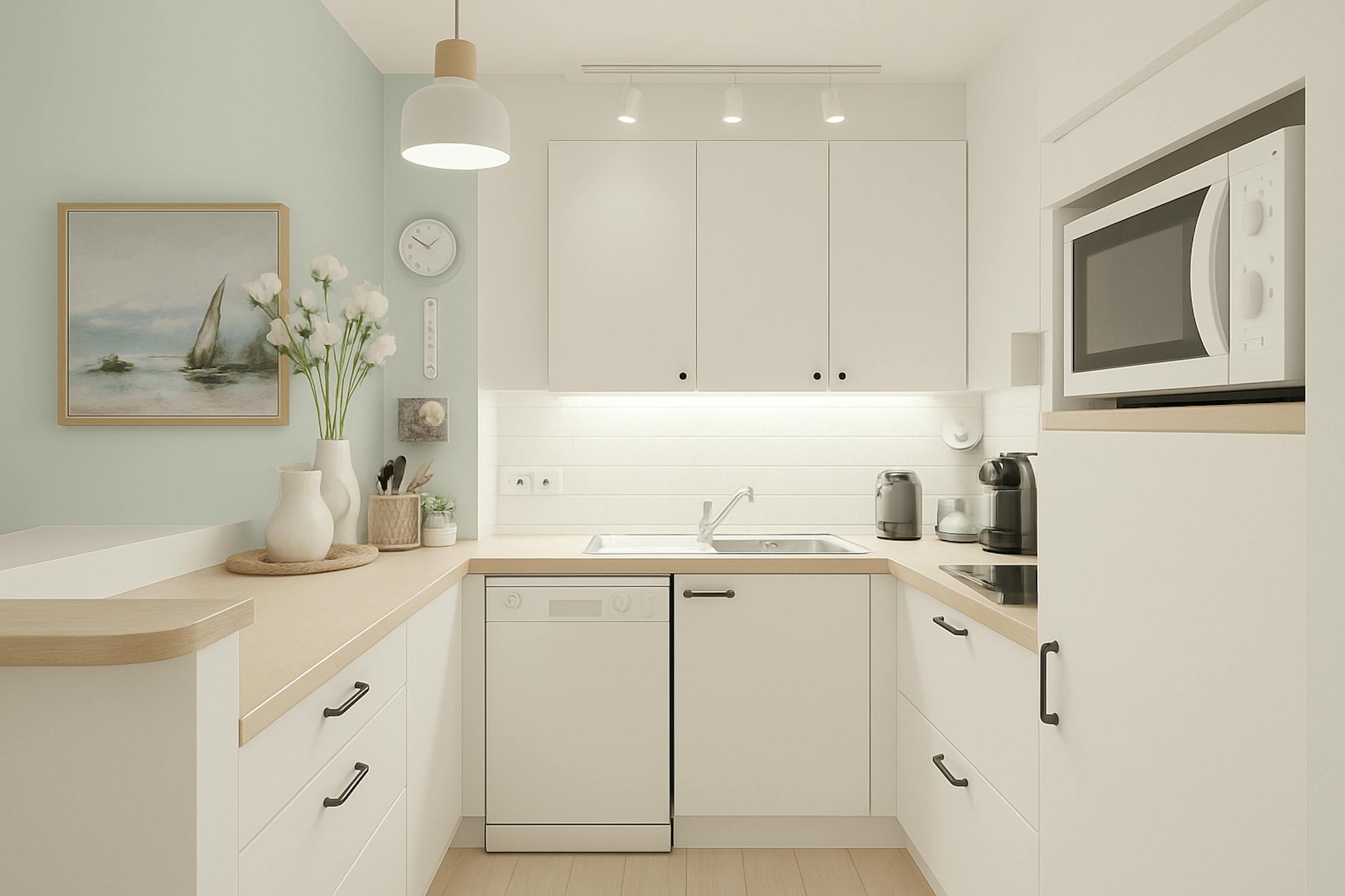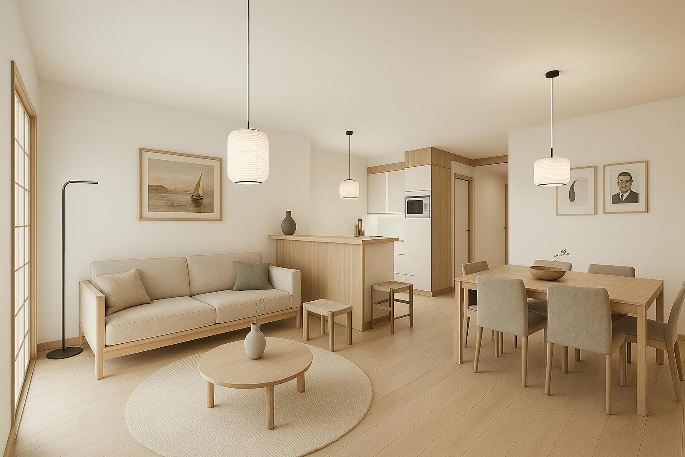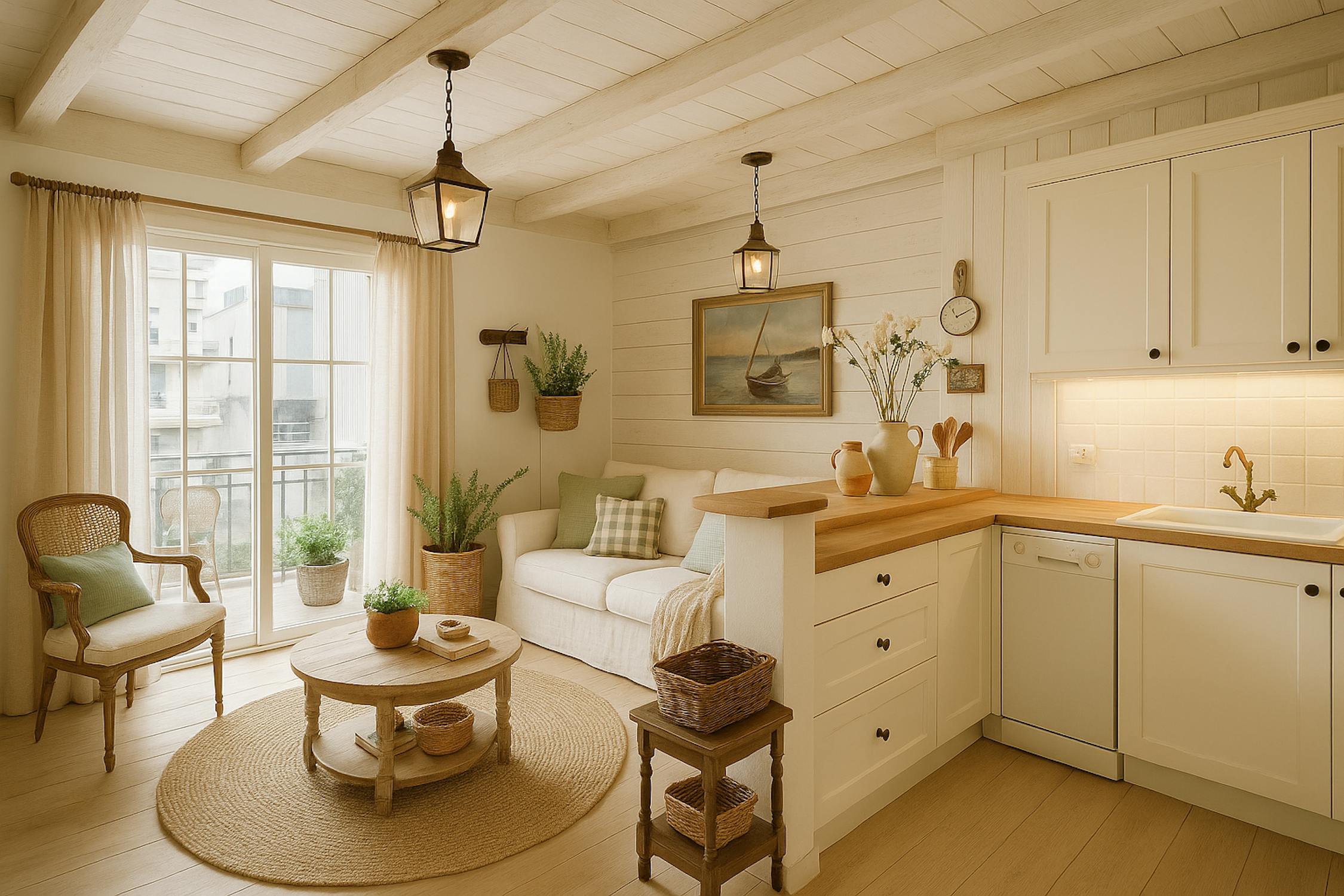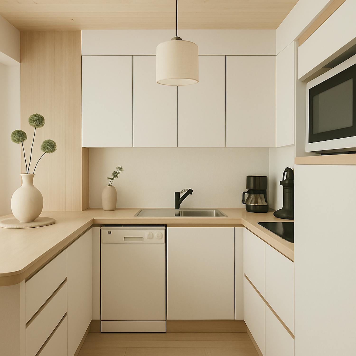 - woonkamer (24m²) met open keuken voorzien van koelkast met diepvriesvakje, vaatwas, elektrische kookplaat en microgolfoven