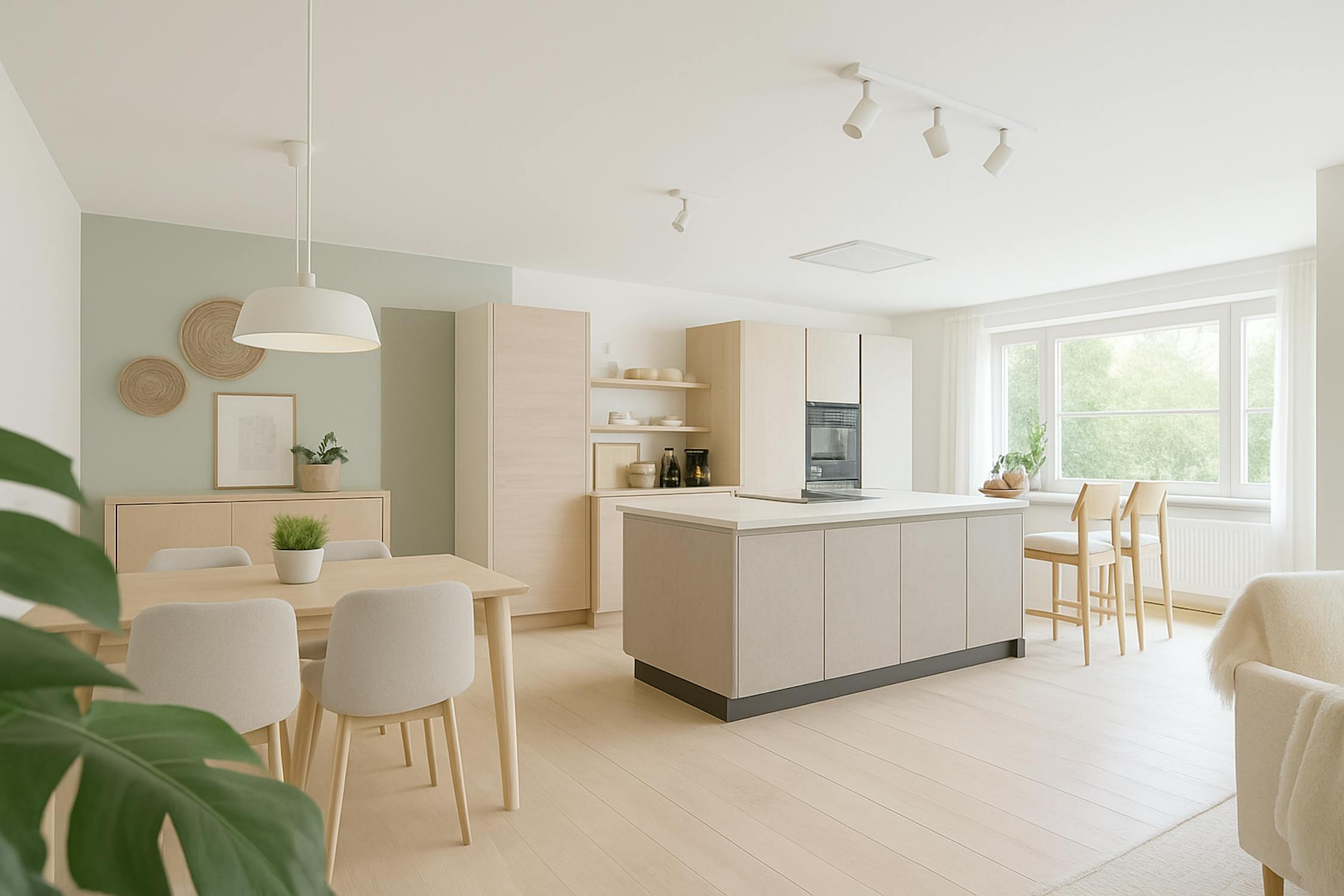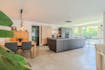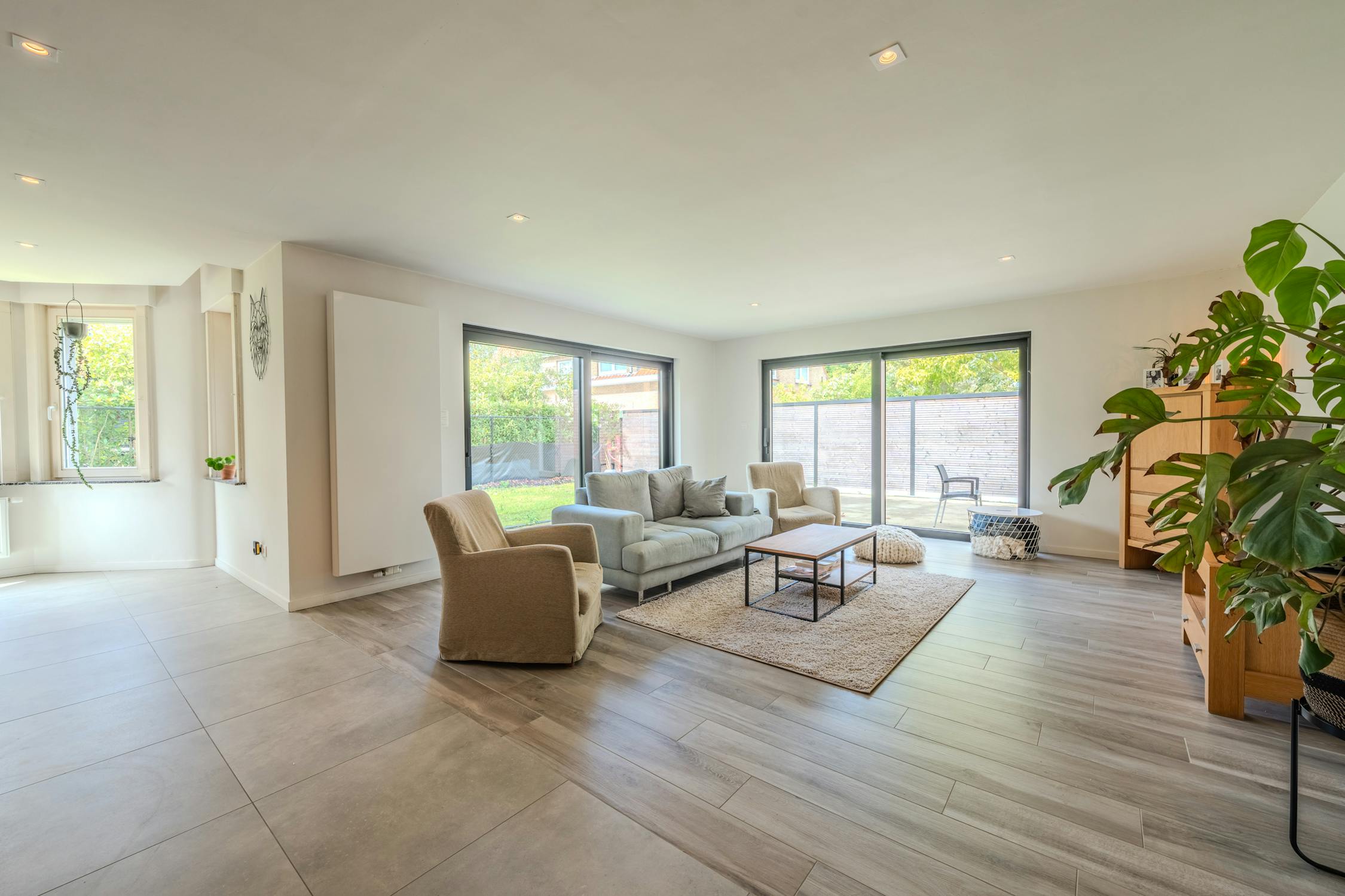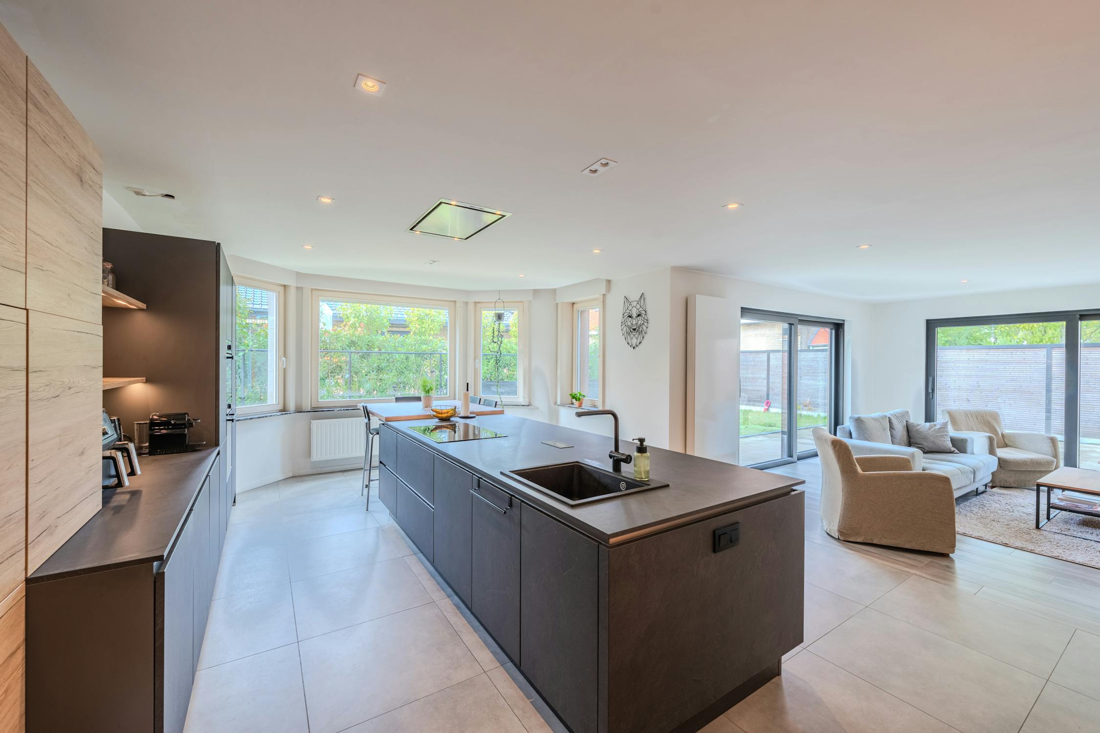 - ruime woonkamer (60m²) met open keuken voorzien van keramische kookplaat, vaatwas, oven, microgolfoven, vaatwas en koelkast met diepvriesvakje