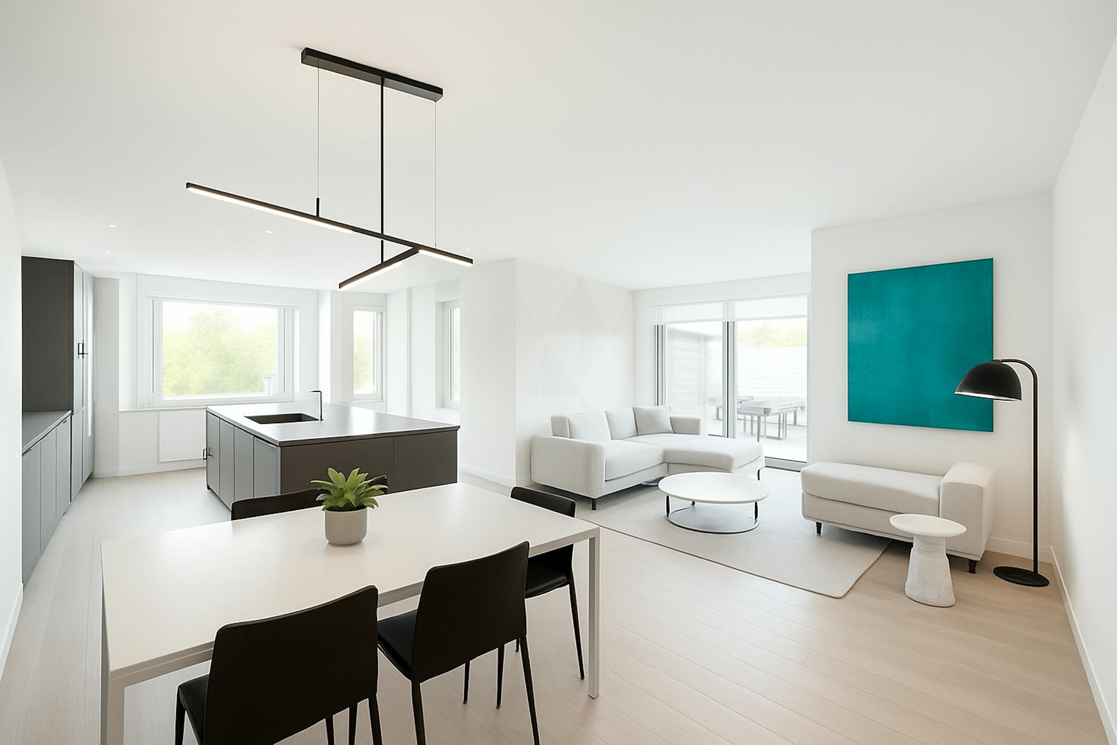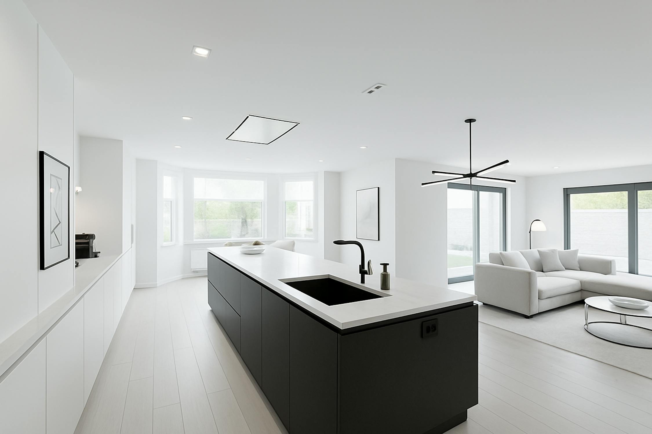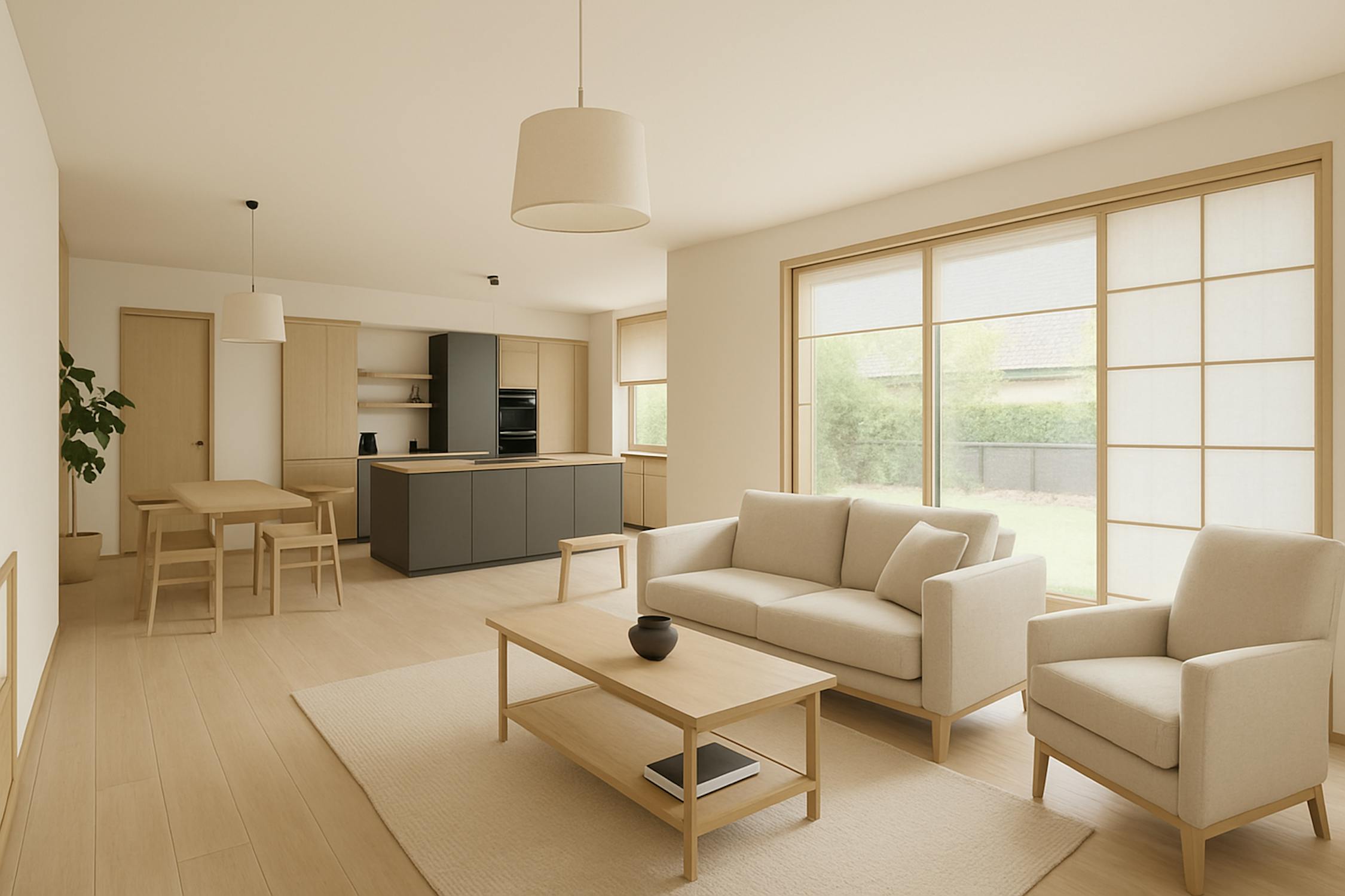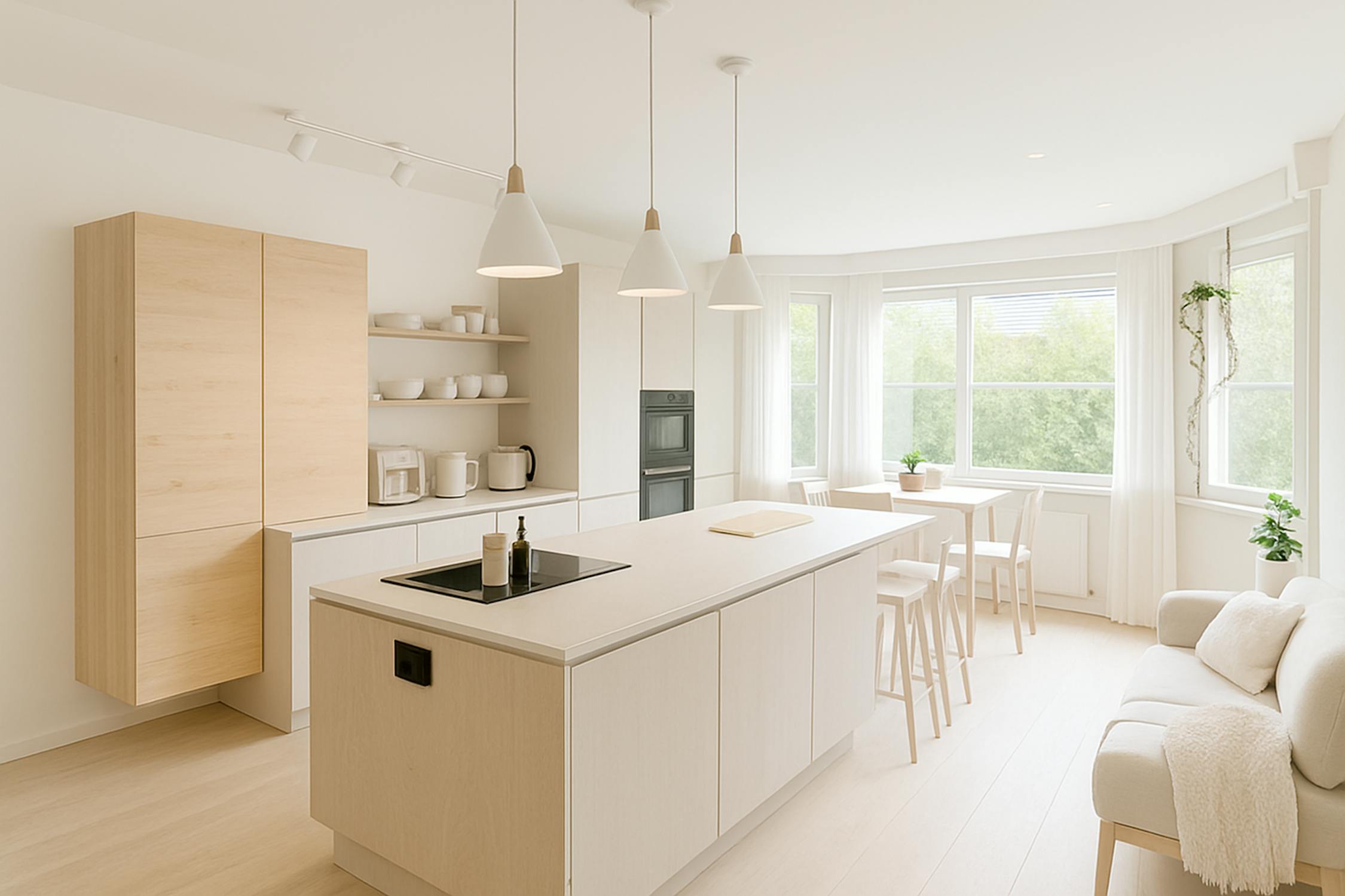 - ruime woonkamer (60m²) met open keuken voorzien van keramische kookplaat, vaatwas, oven, microgolfoven, vaatwas en koelkast met diepvriesvakje