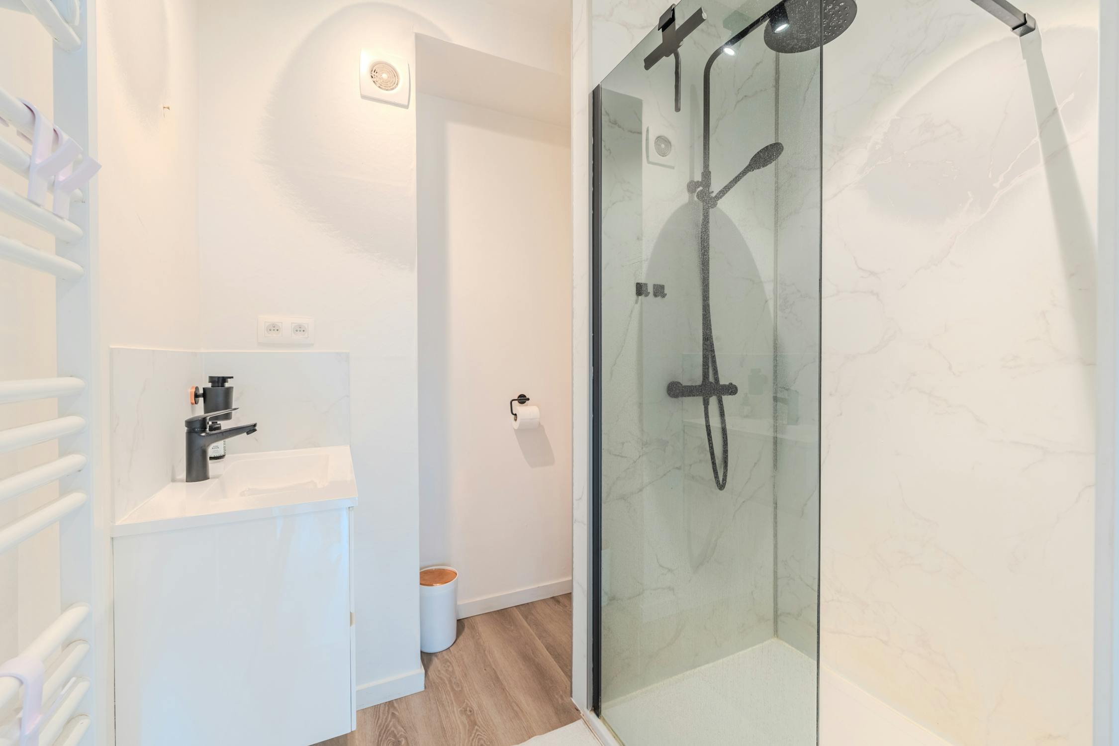 - badkamer (4m²) met douche, lavabo en toilet