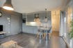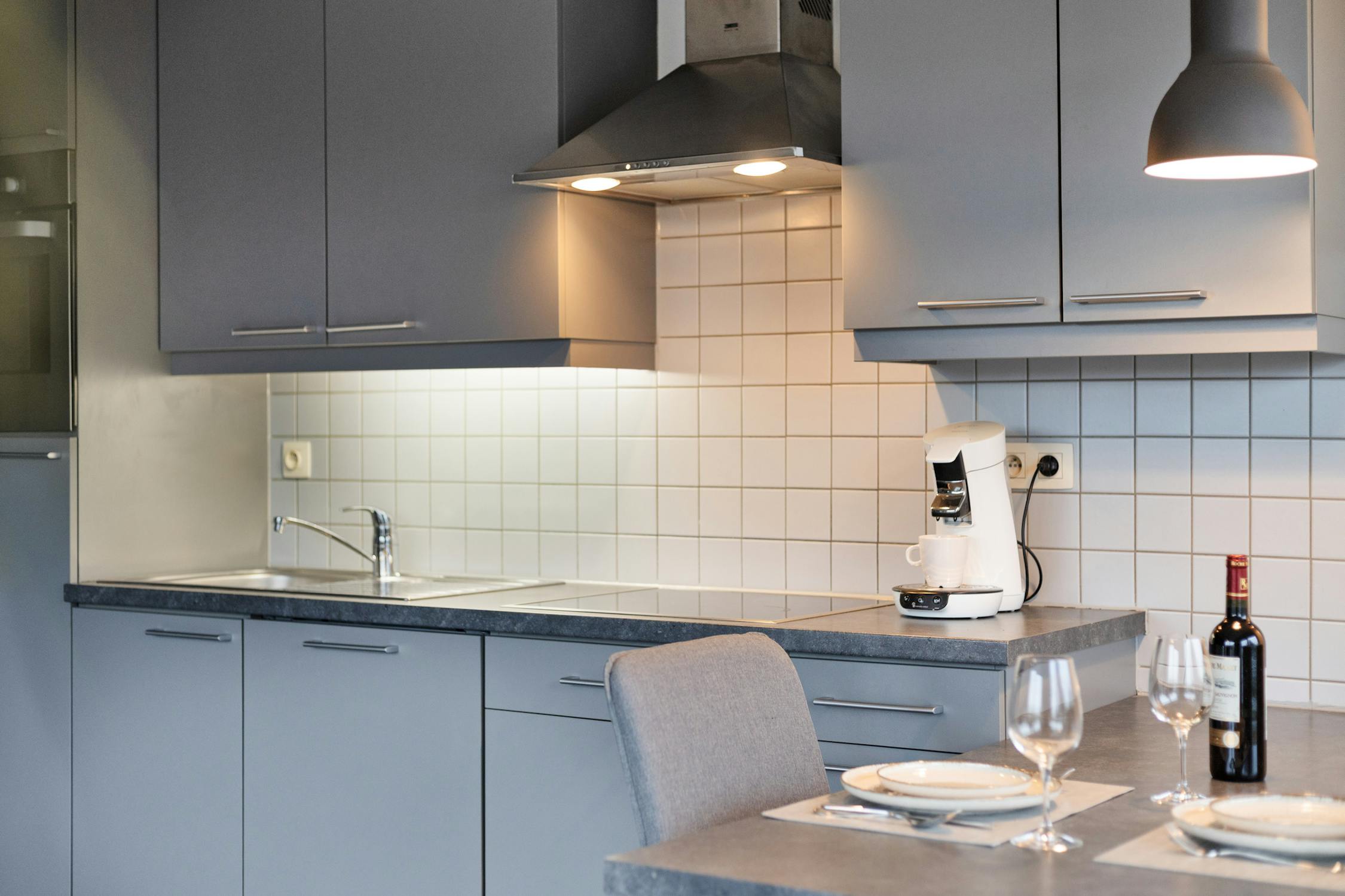 - ingerichte keukenhoek met vitrokeramische kookplaat, koelkast, oven, vaatwas, dampkap en spoelbak
