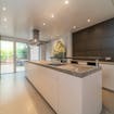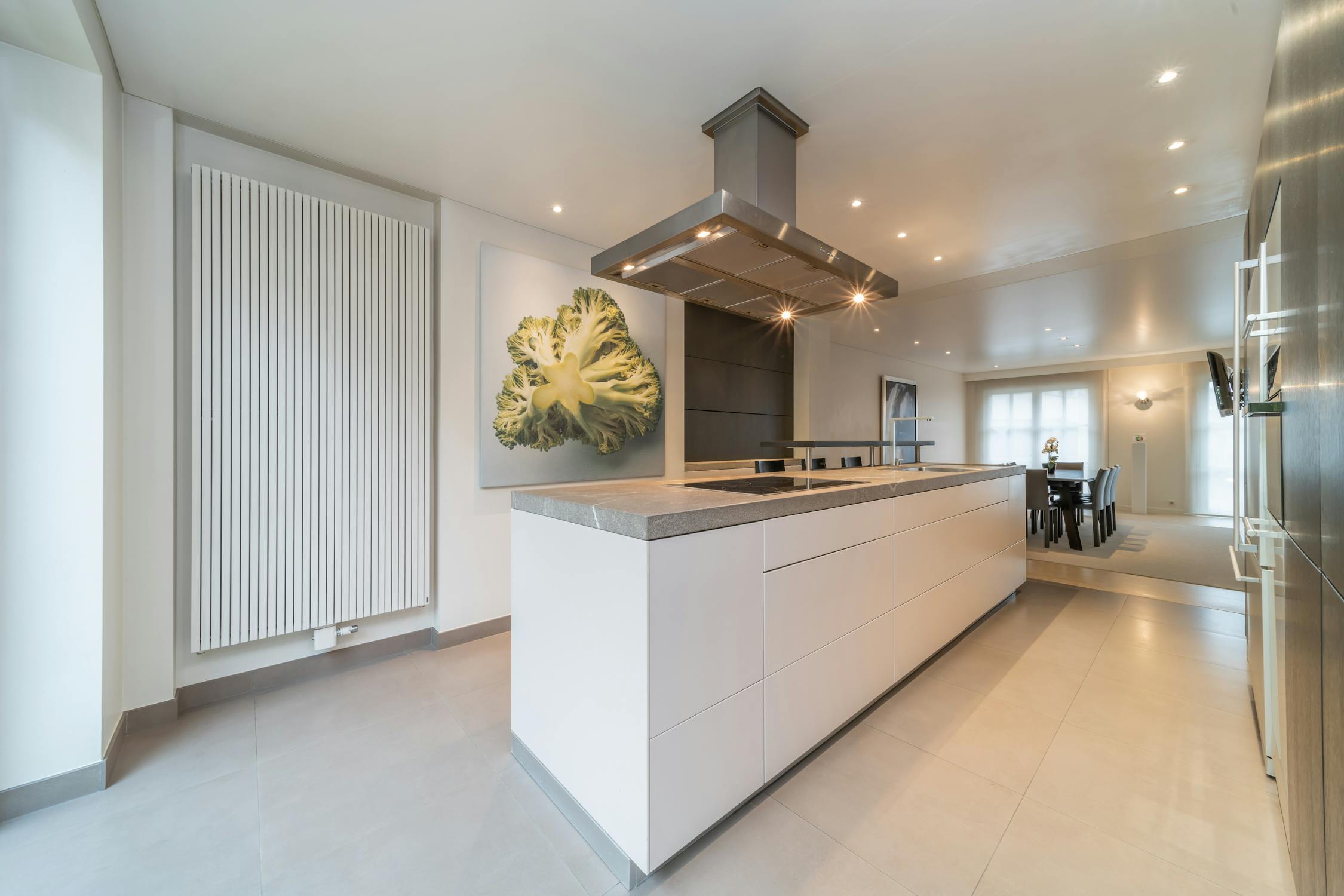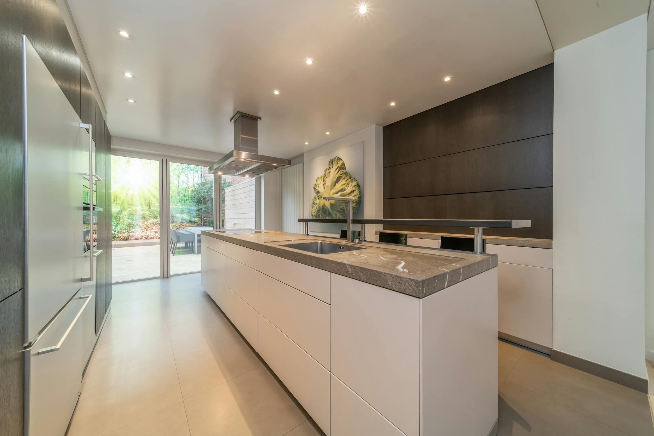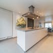 - op maat gemaakte open keuken voorzien van kookplaat, combi oven, steamer, vaatwasmachine, koelkast en diepvries