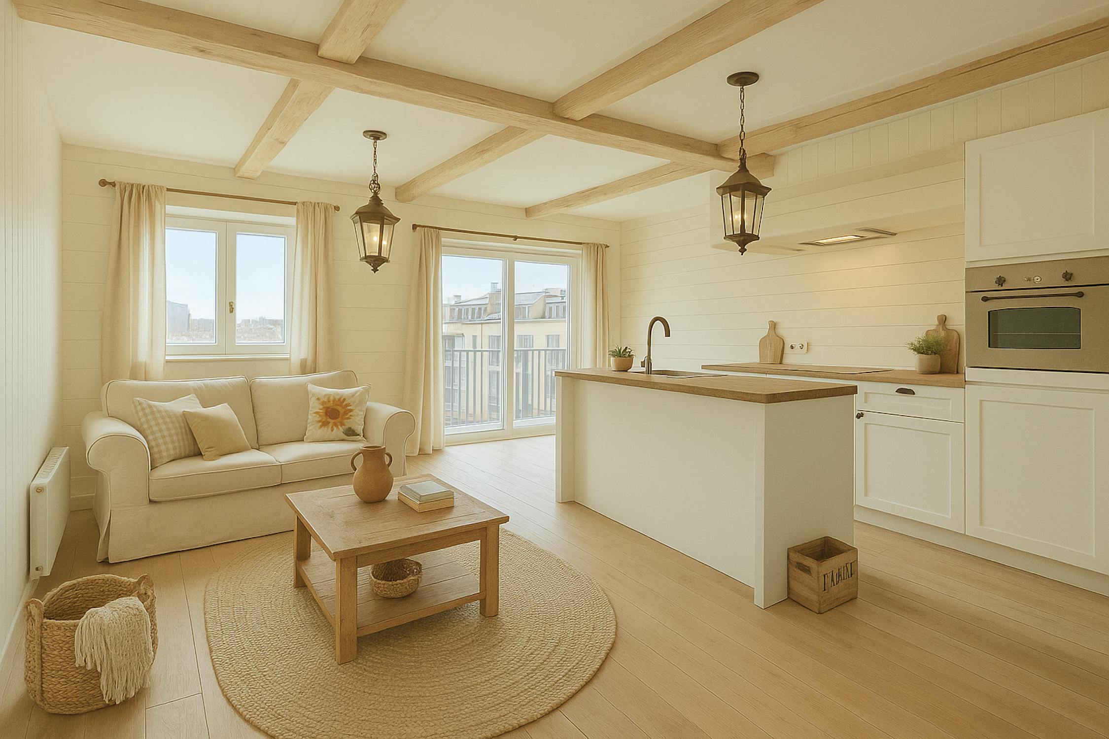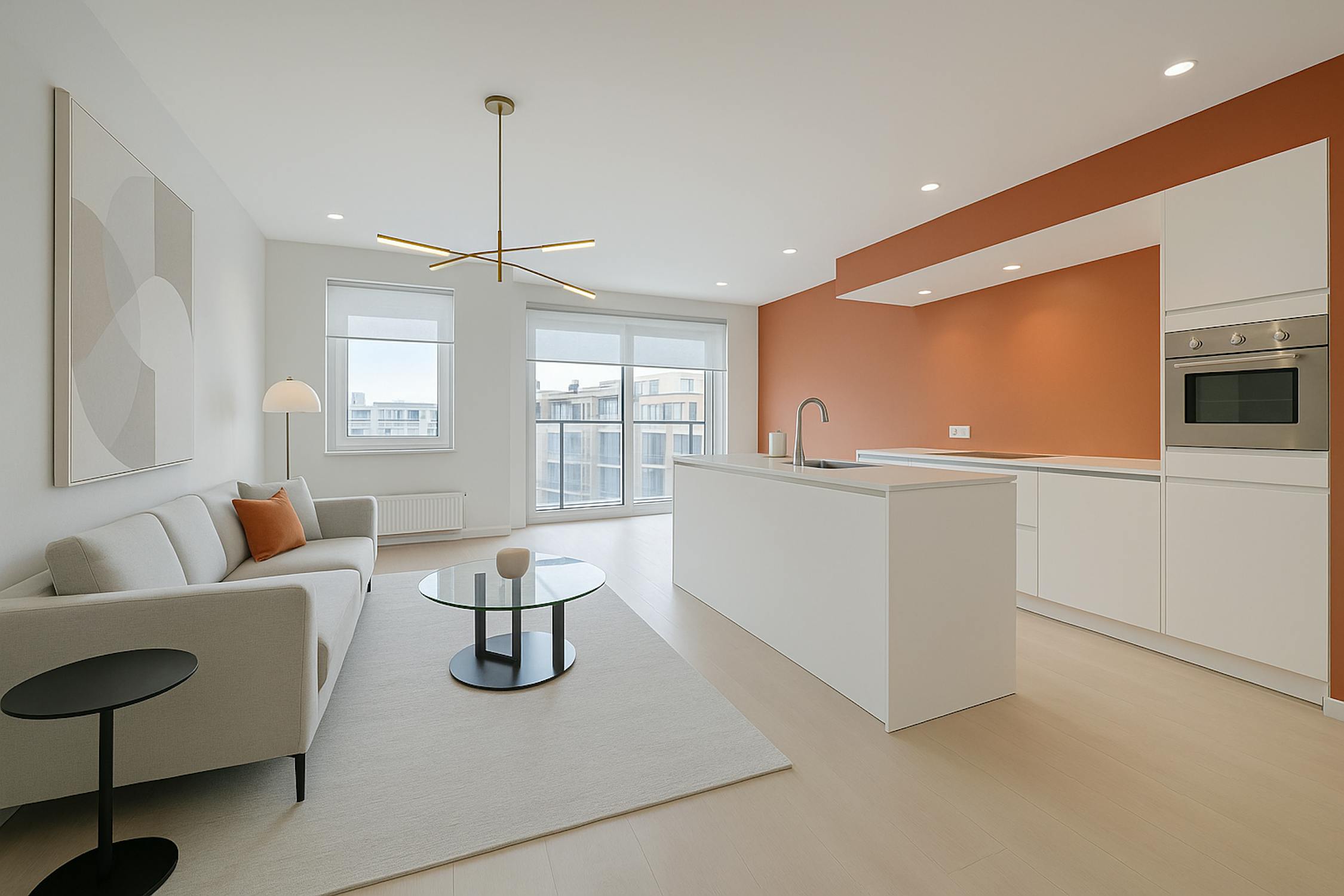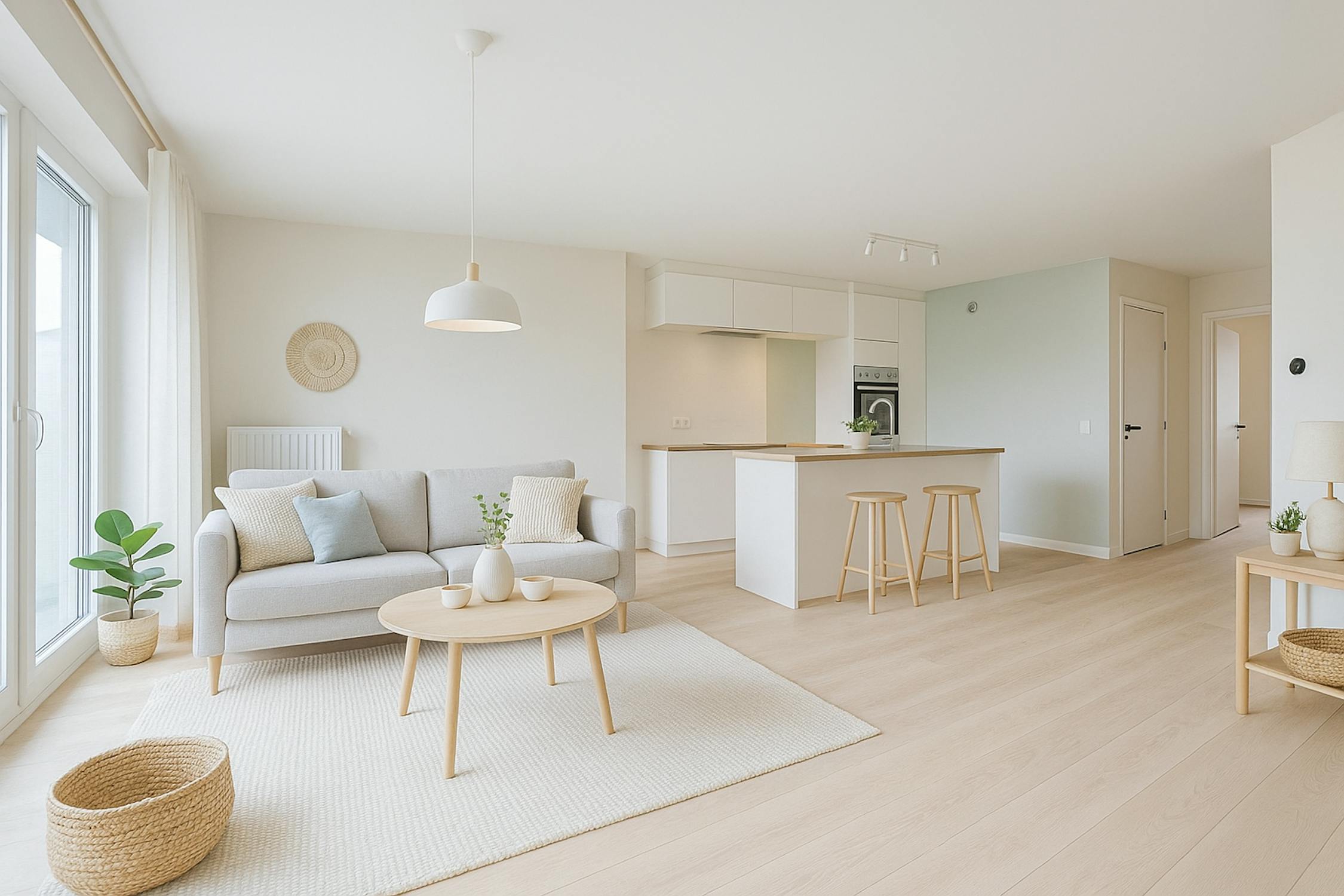 - Ruime en lichtrijke leefruimte met toegang tot het terras aan de voorkant;