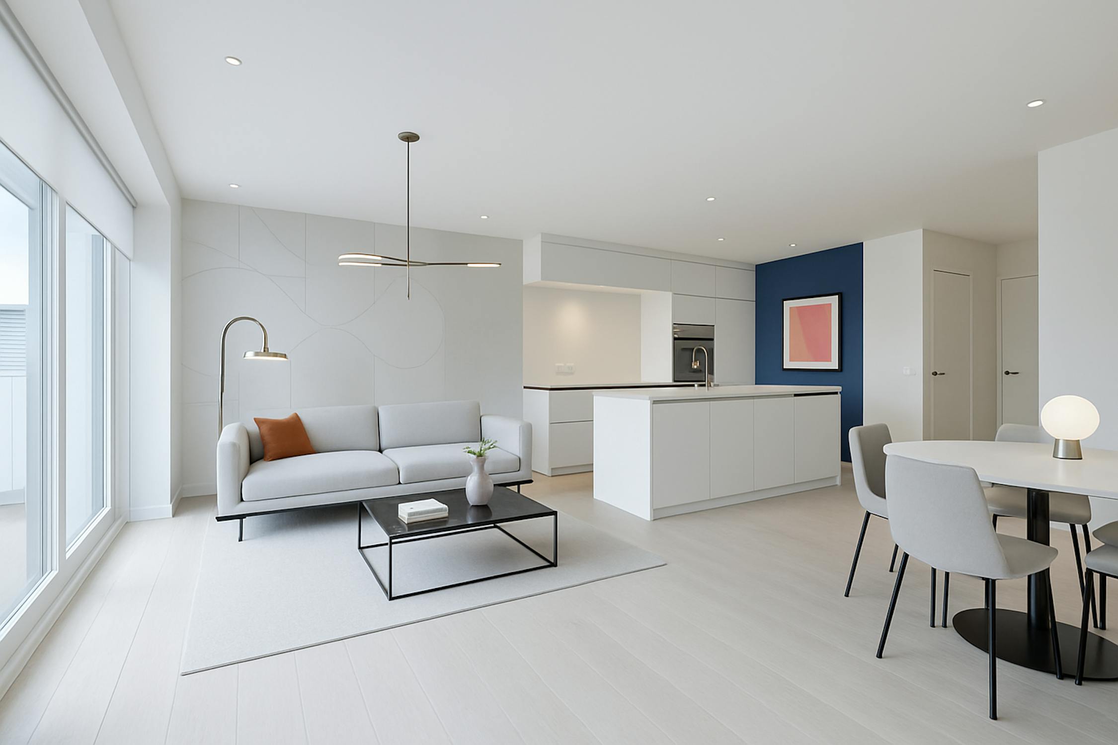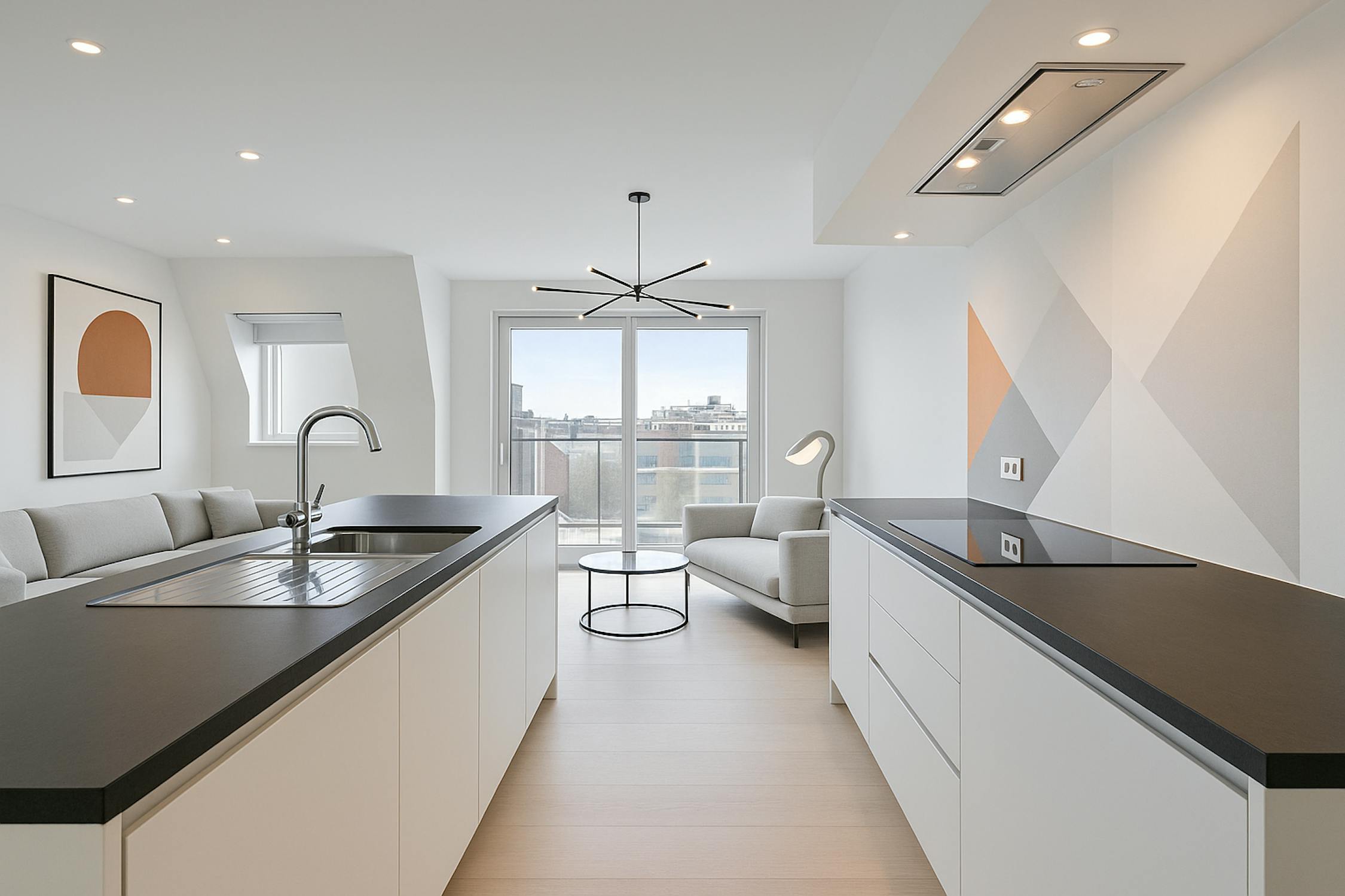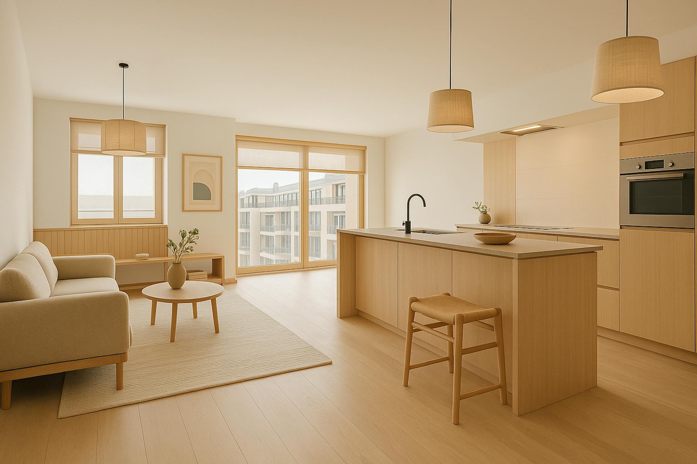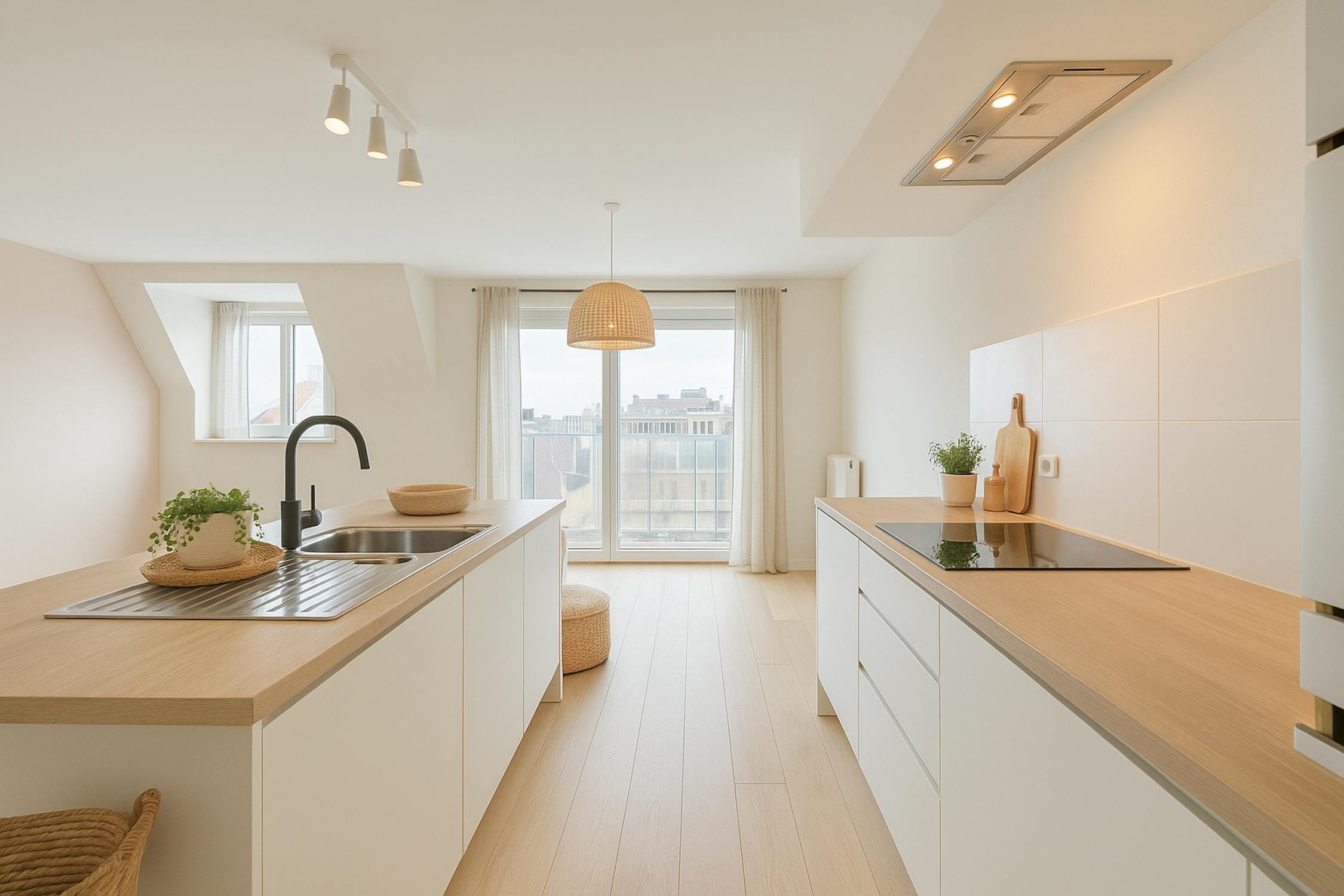- Ruime en lichtrijke leefruimte met toegang tot het terras aan de voorkant;