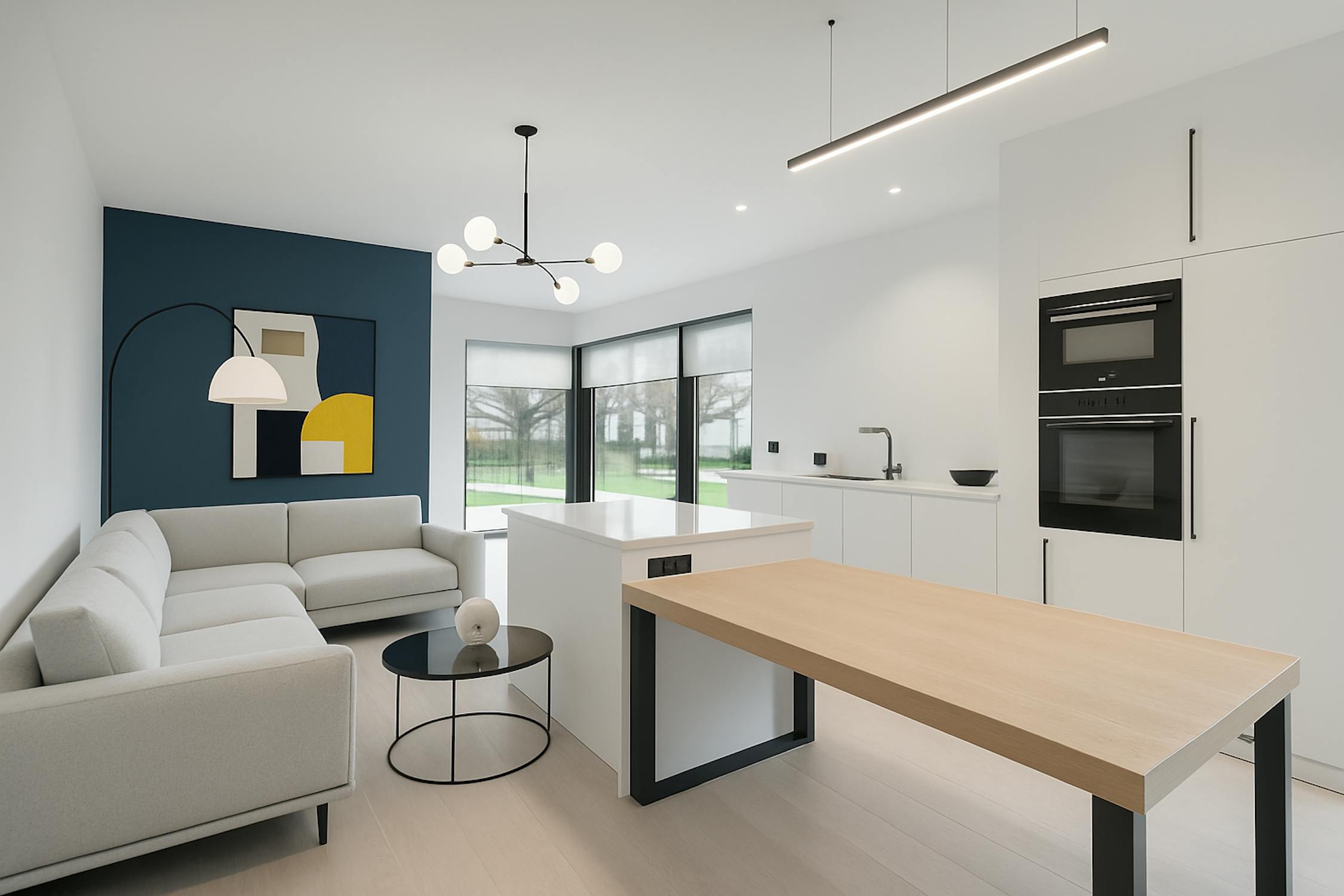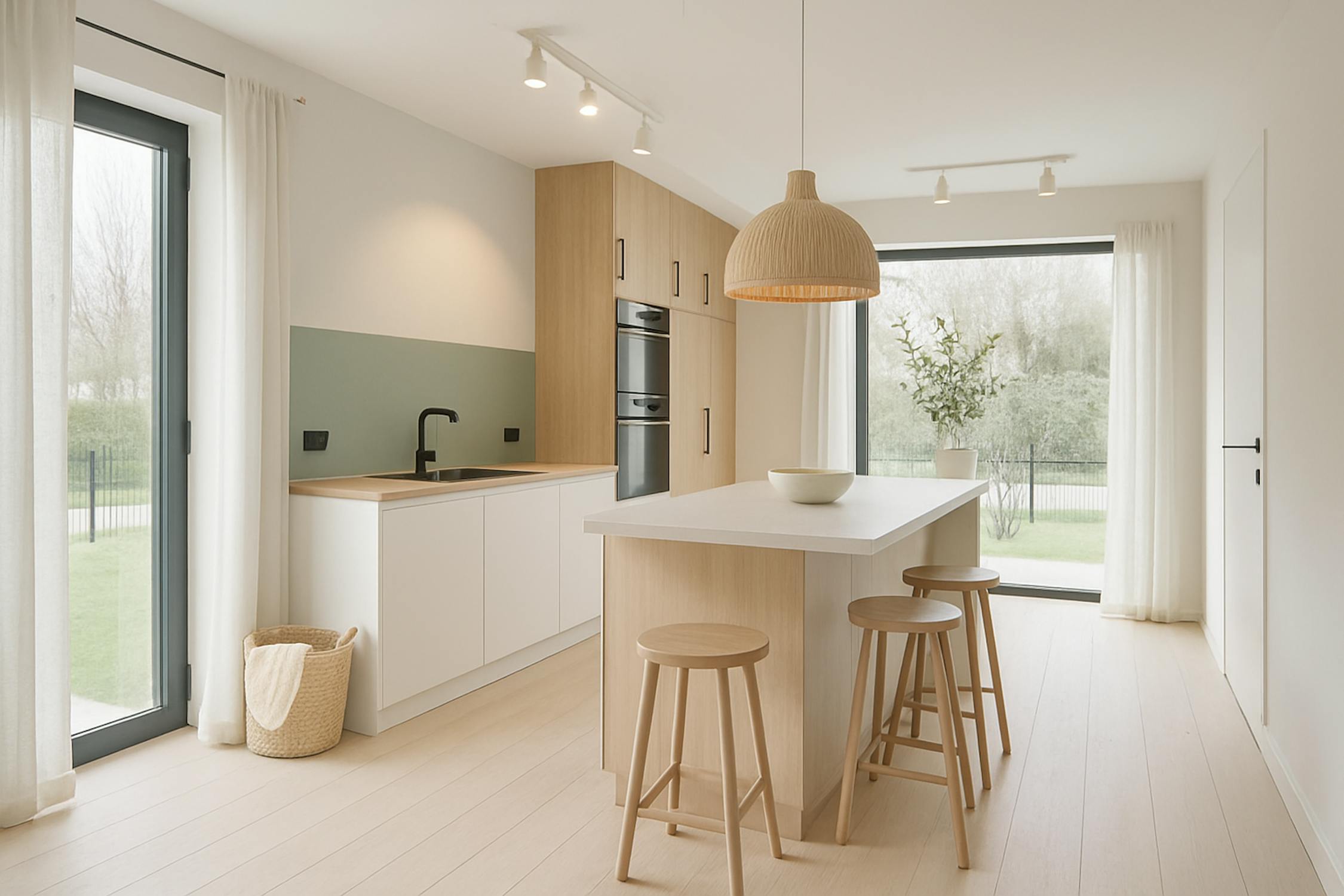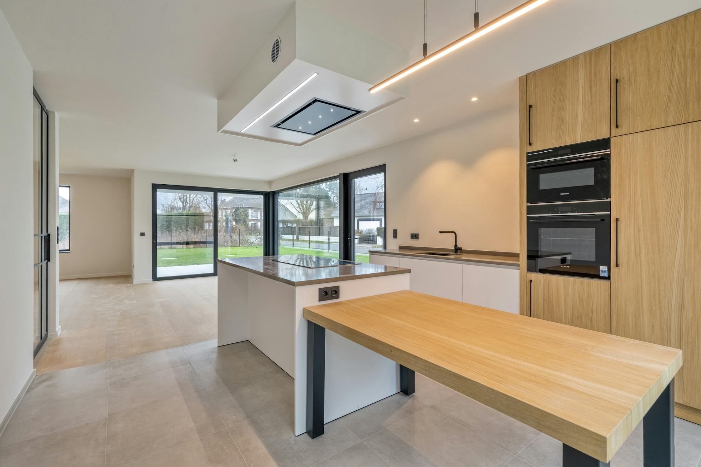 - open keuken met kookeiland voorzien van inductiekookplaat, dampkap, dubbele spoelbak, oven, microgolfoven, koelkast en vaatwasmachine;