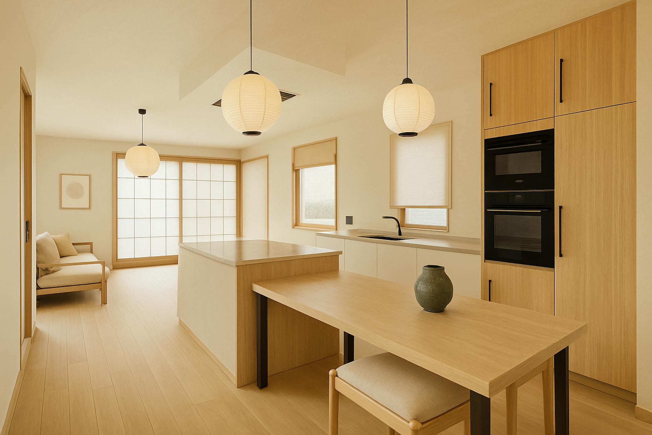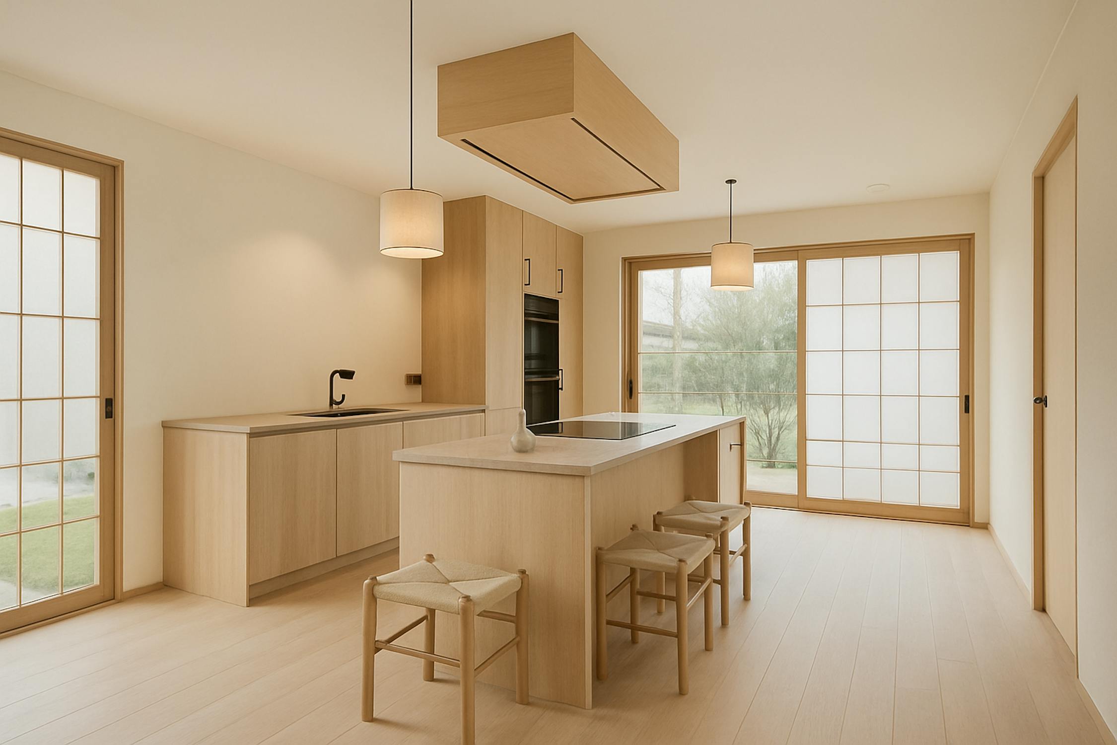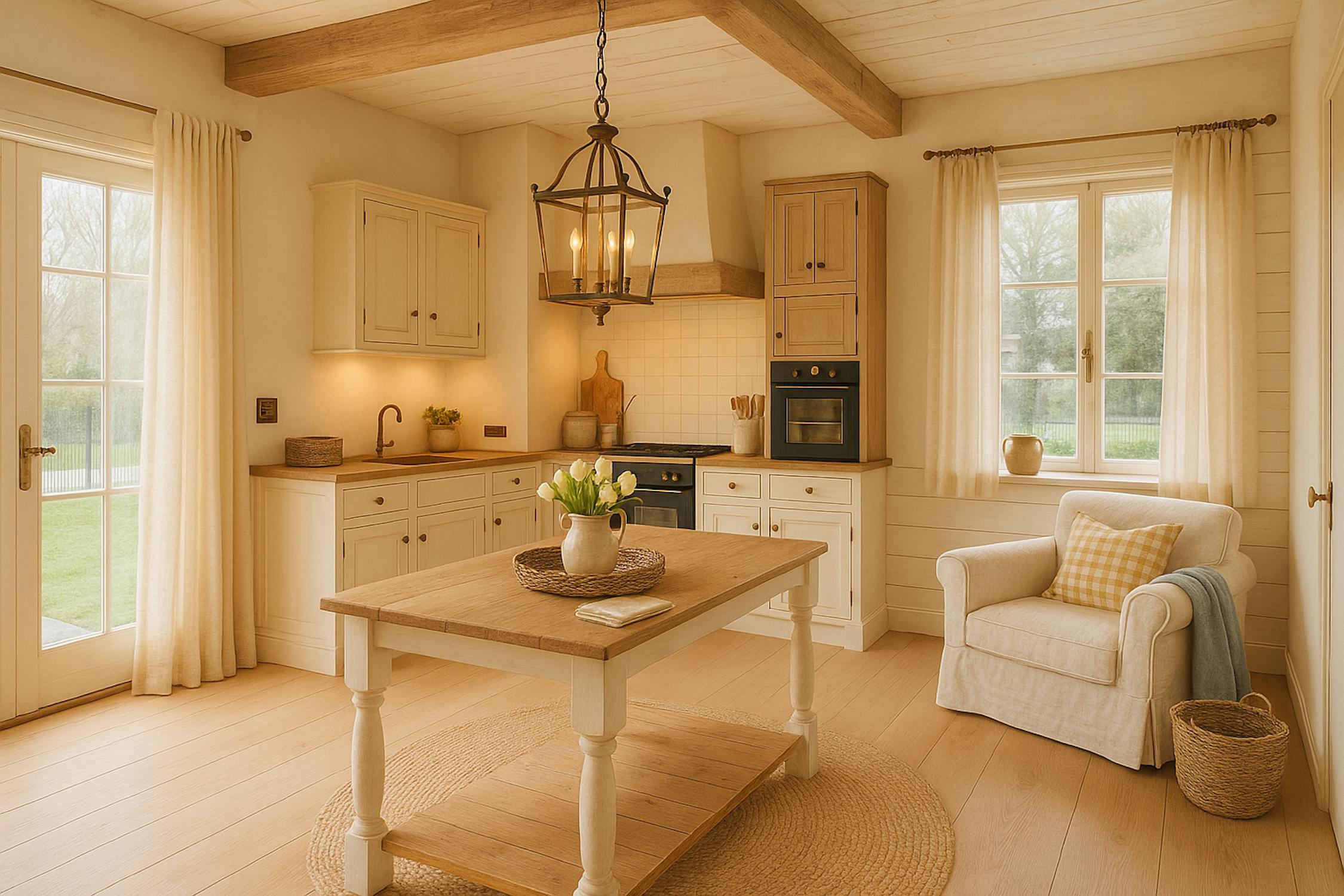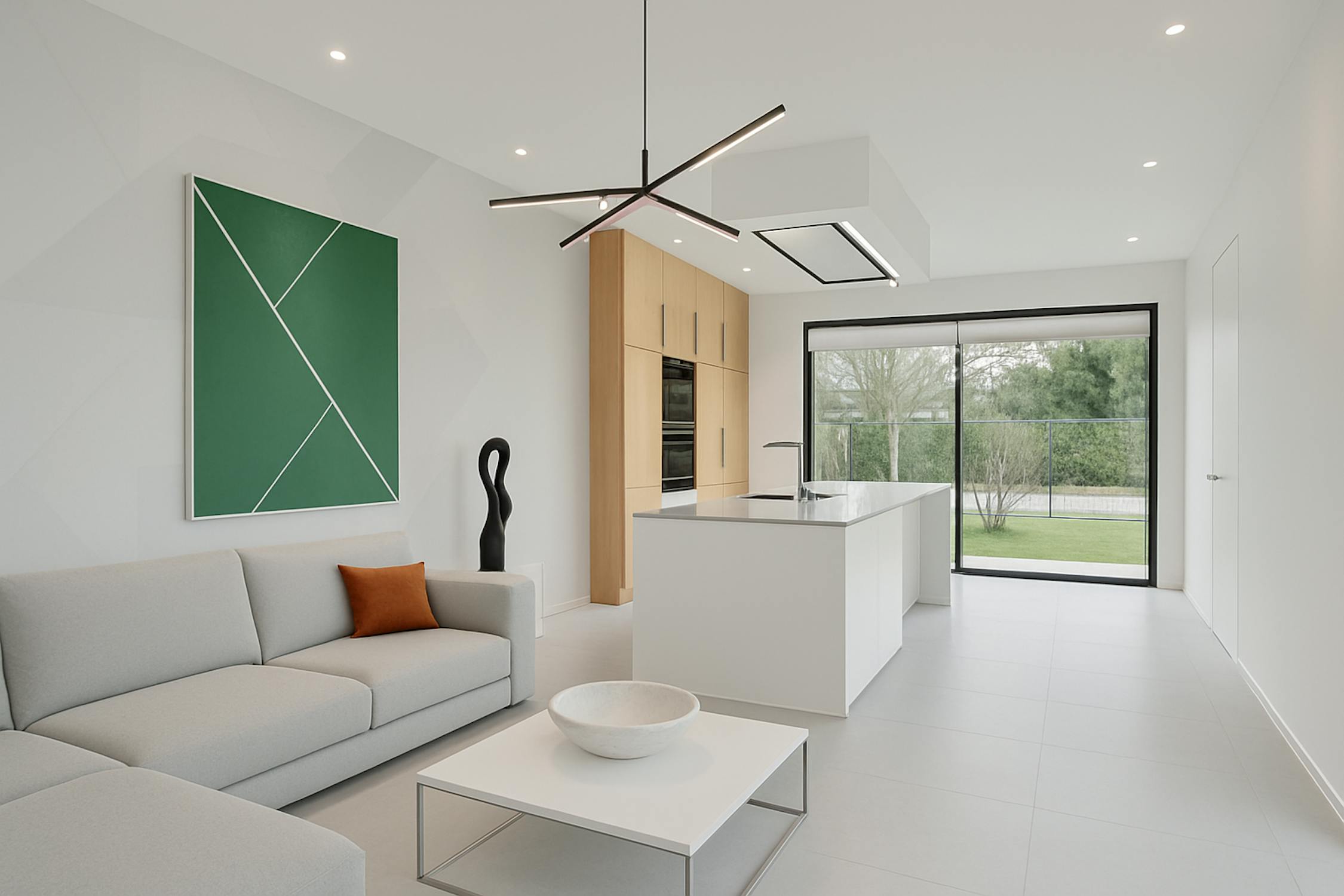 - open keuken met kookeiland voorzien van inductiekookplaat, dampkap, dubbele spoelbak, oven, microgolfoven, koelkast en vaatwasmachine;