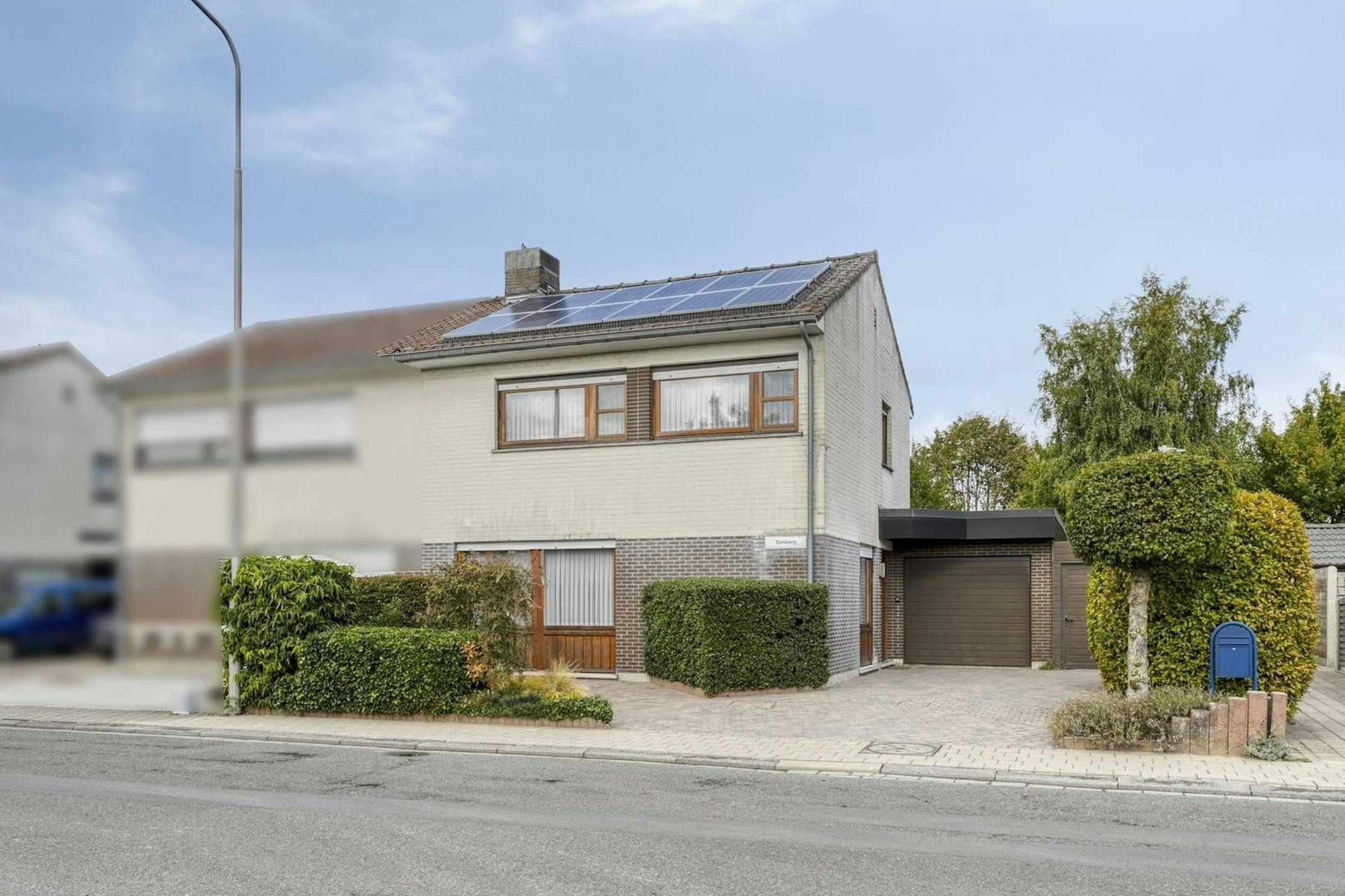 Inkomhal met gastentoilet - leefruimte met houthaard - geïnstalleerde keuken - ruime berging - oprit met garage