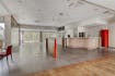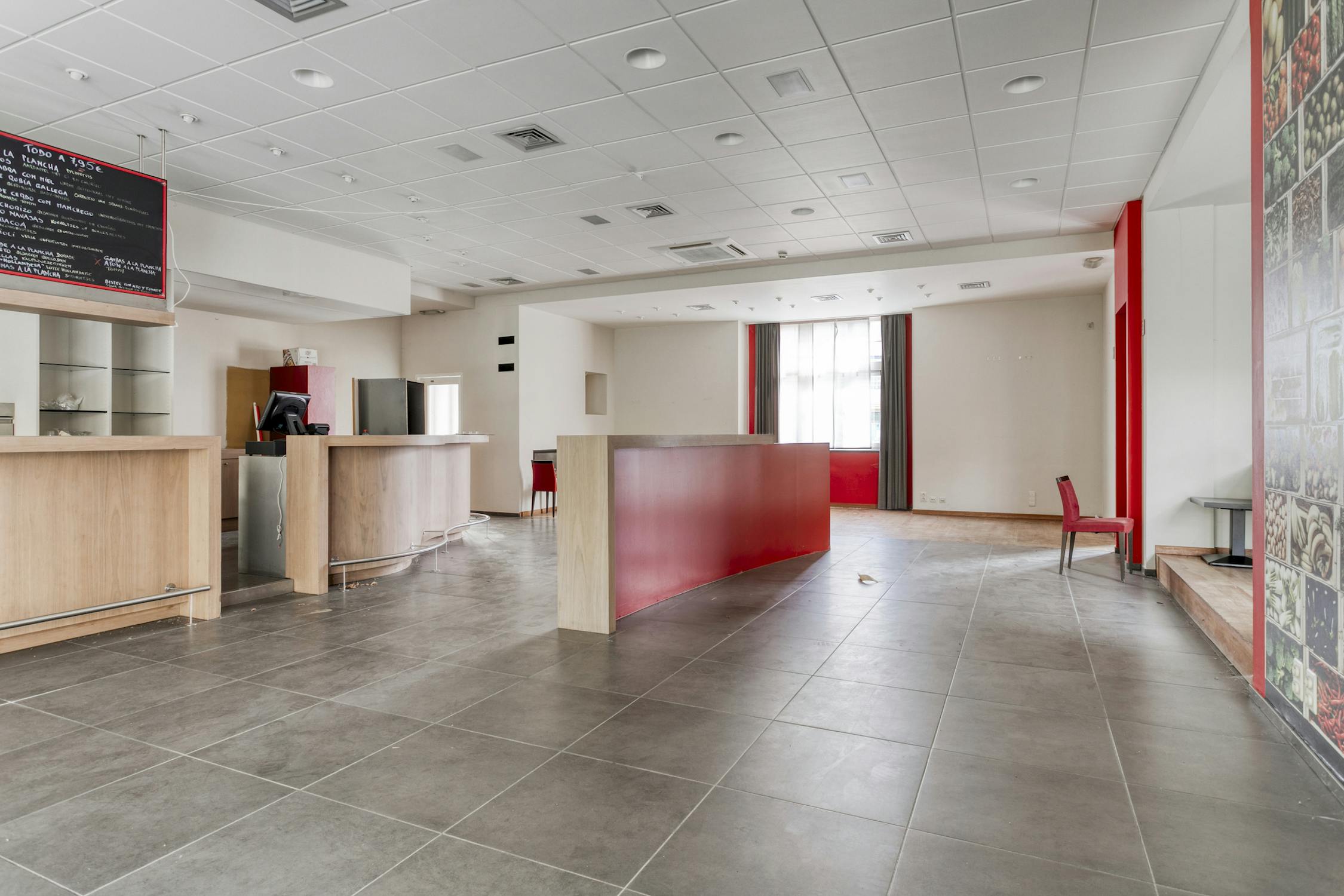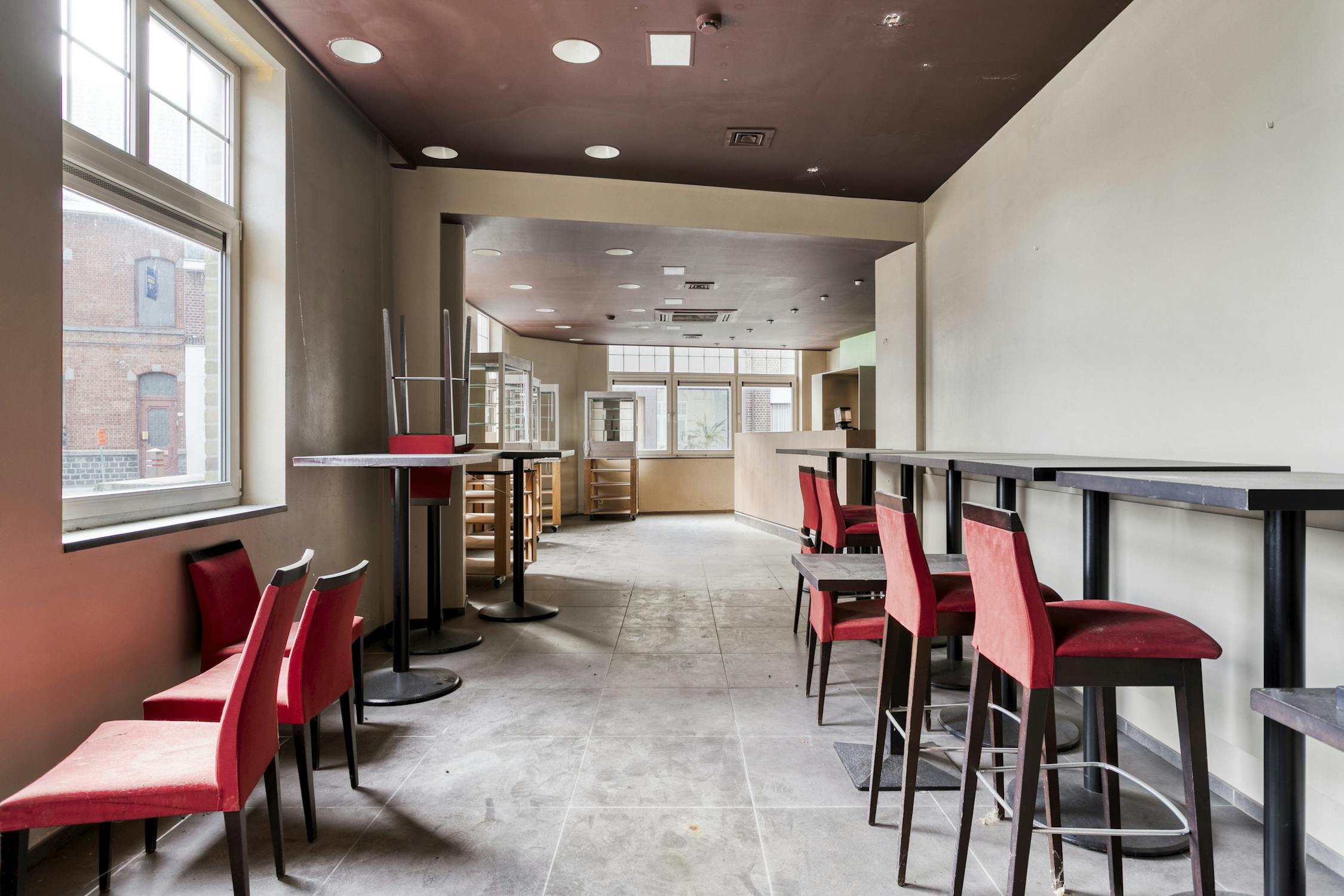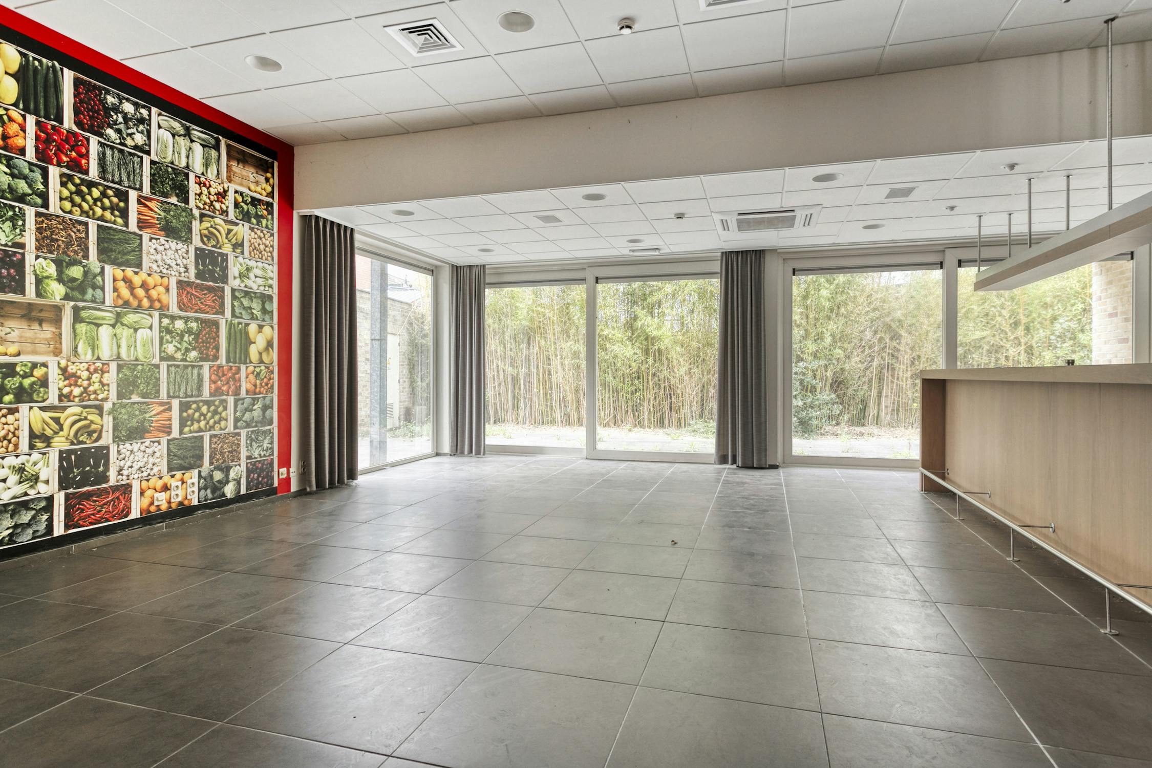 Gelijkvloers: Café met keuken en sanitaire blok - ruime (feest)zaal met bar en keuken - terras - sanitaire blok in de kelder.