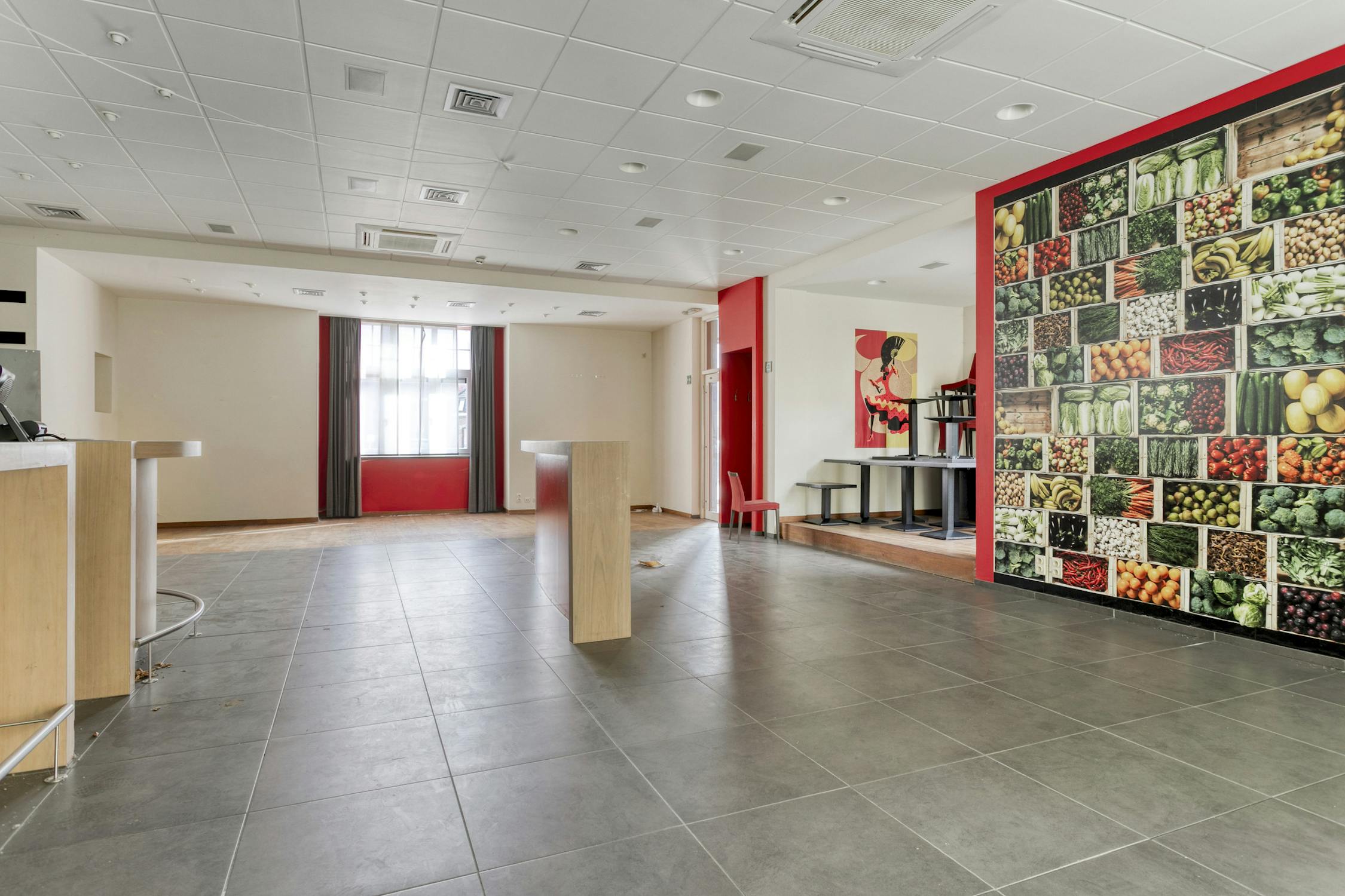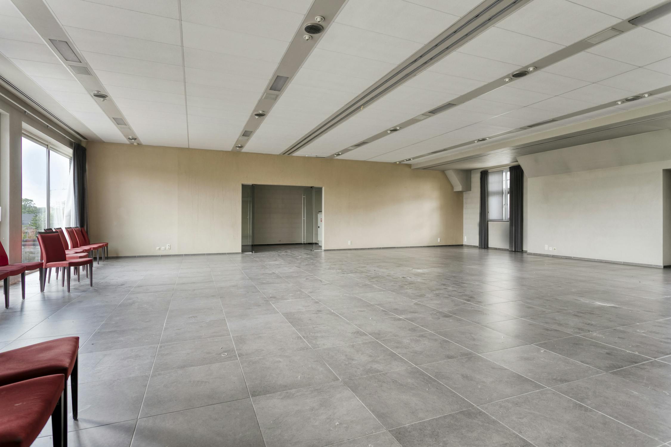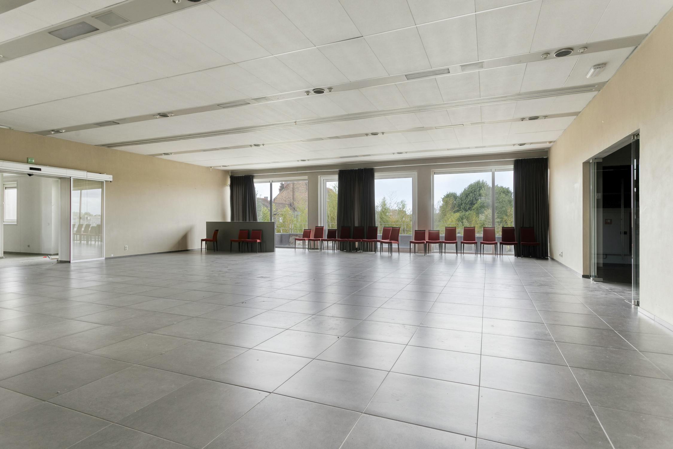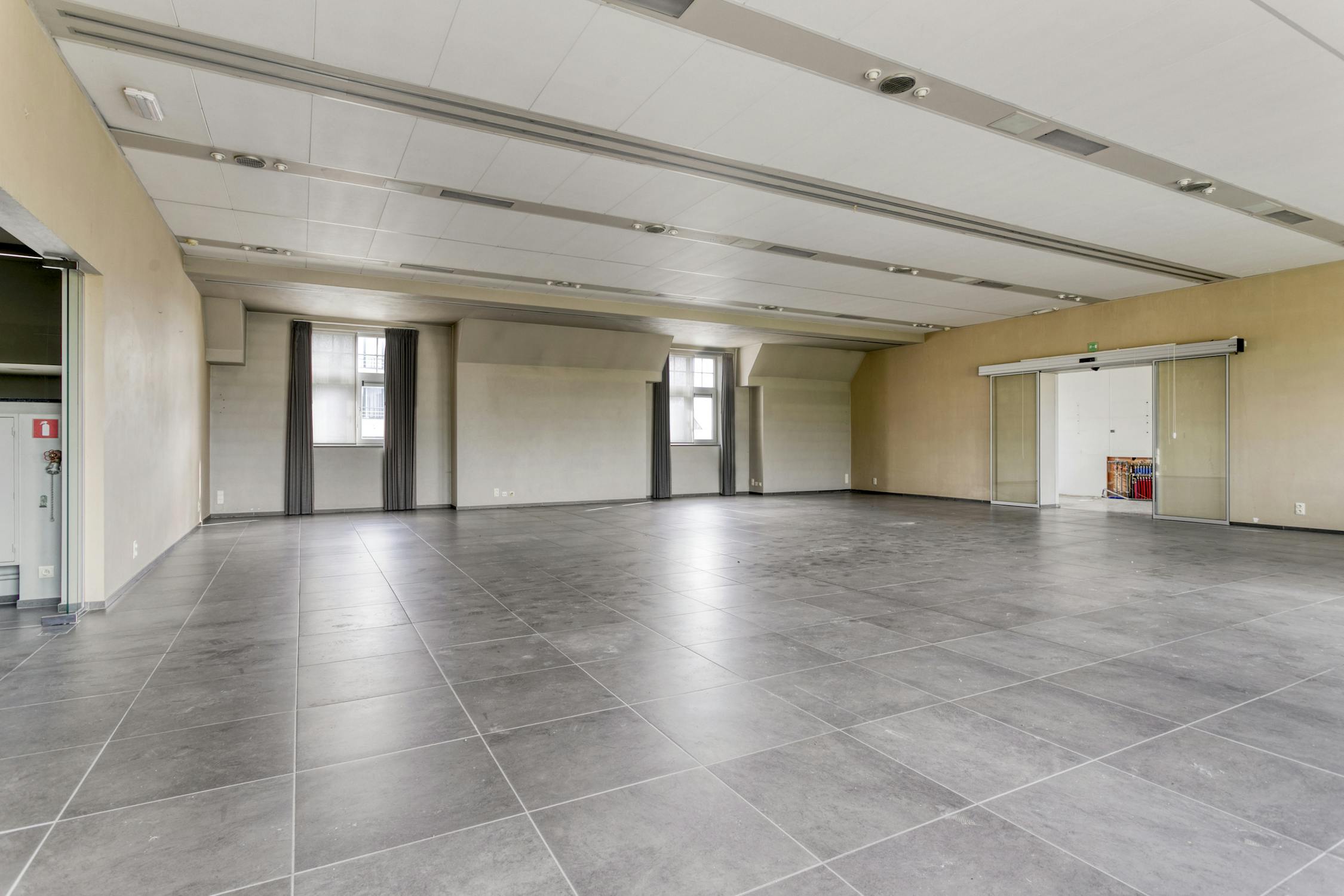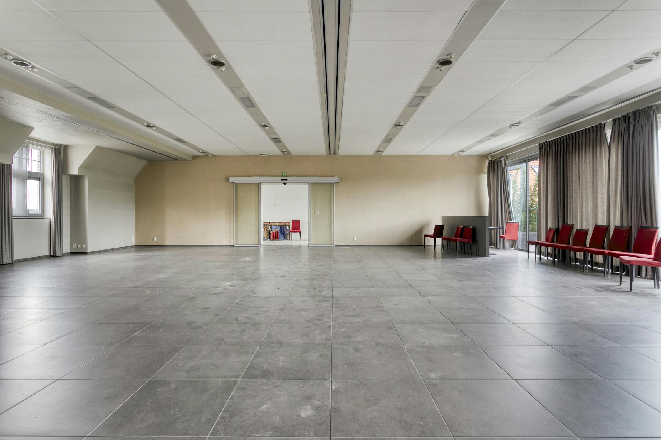 Eerste verdieping: Feestzaal - keuken - appartement (twee slaapkamers en badkamer).
