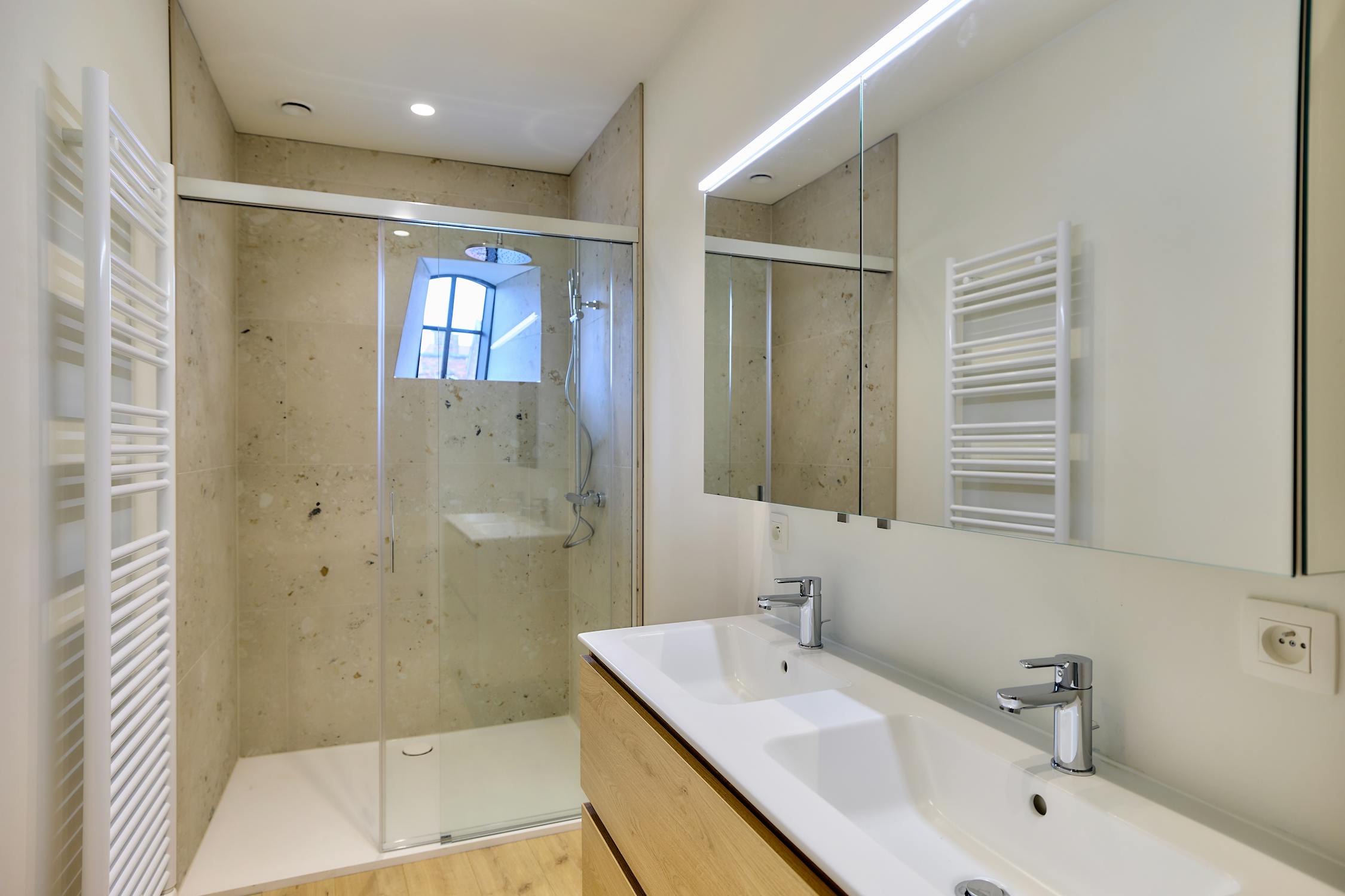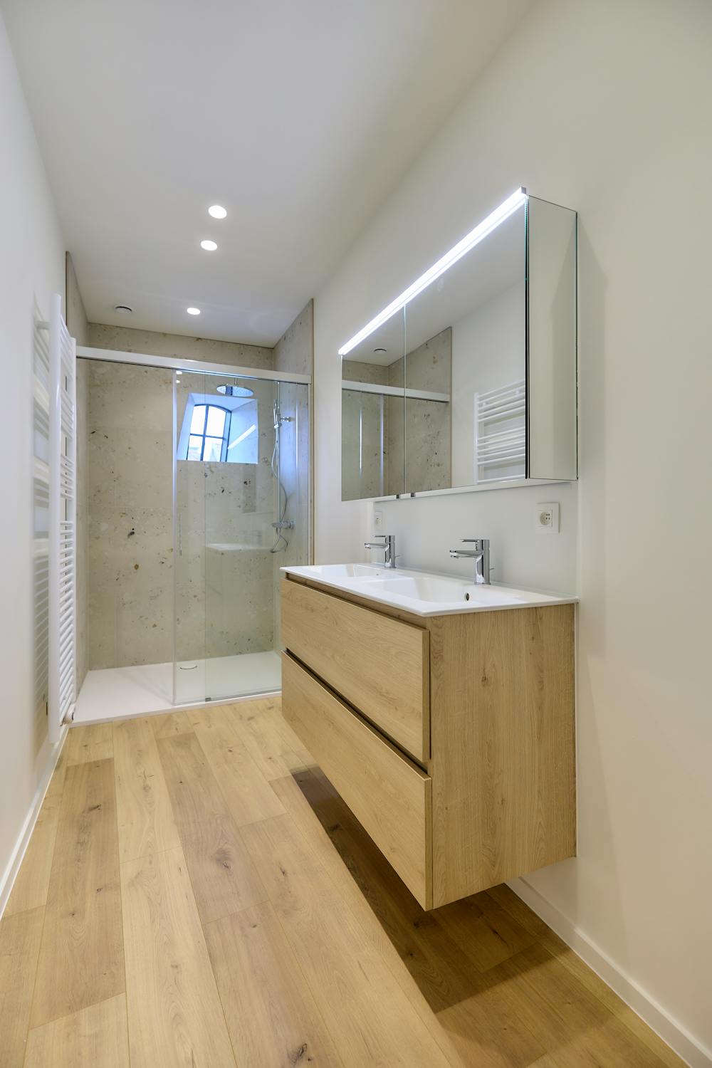 Tweede verdieping (bereikbaar met lift): Nachthal met toilet - twee mooie kamers met elk hun eigen badkamer, voorzien van lavabomeubel en douche.