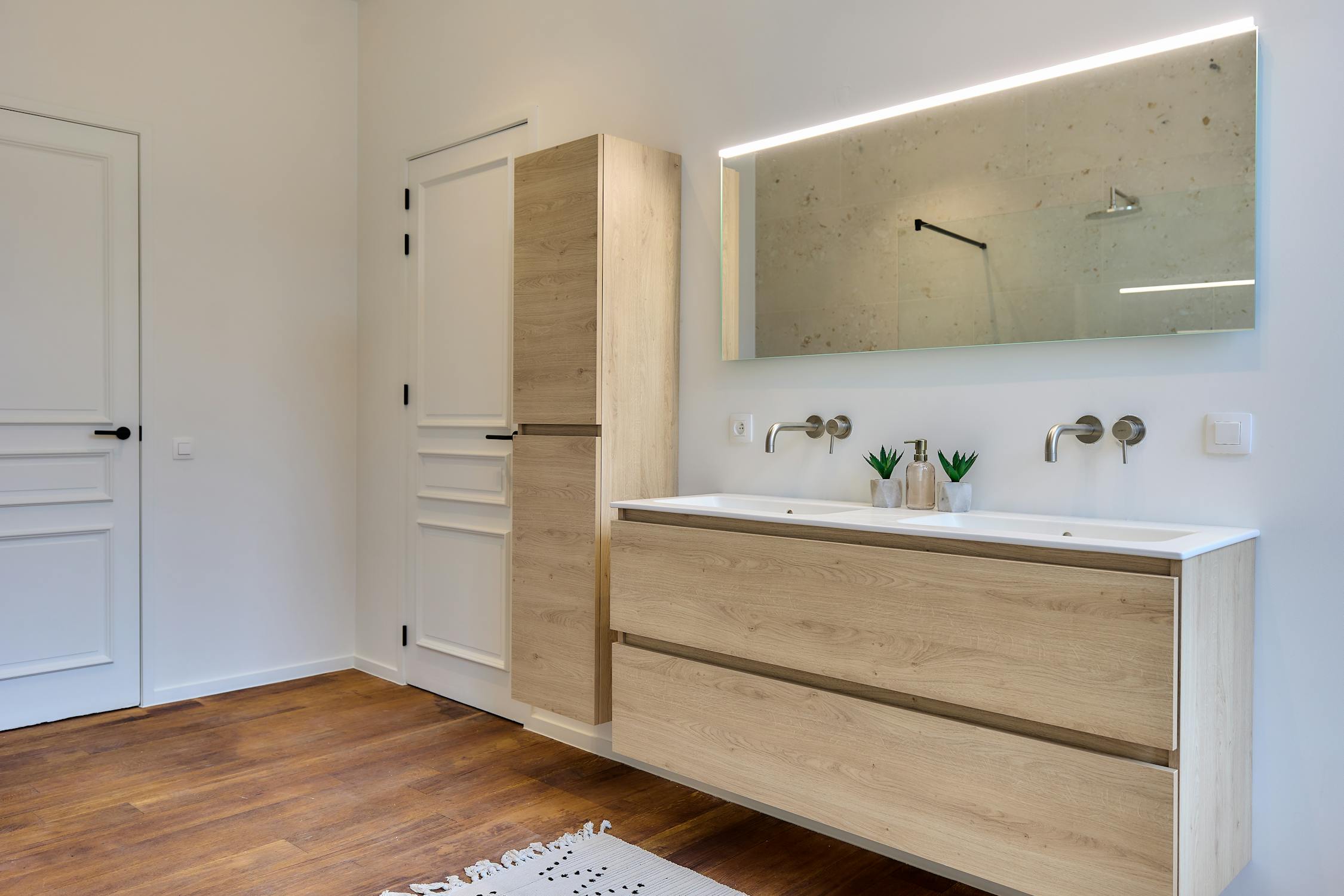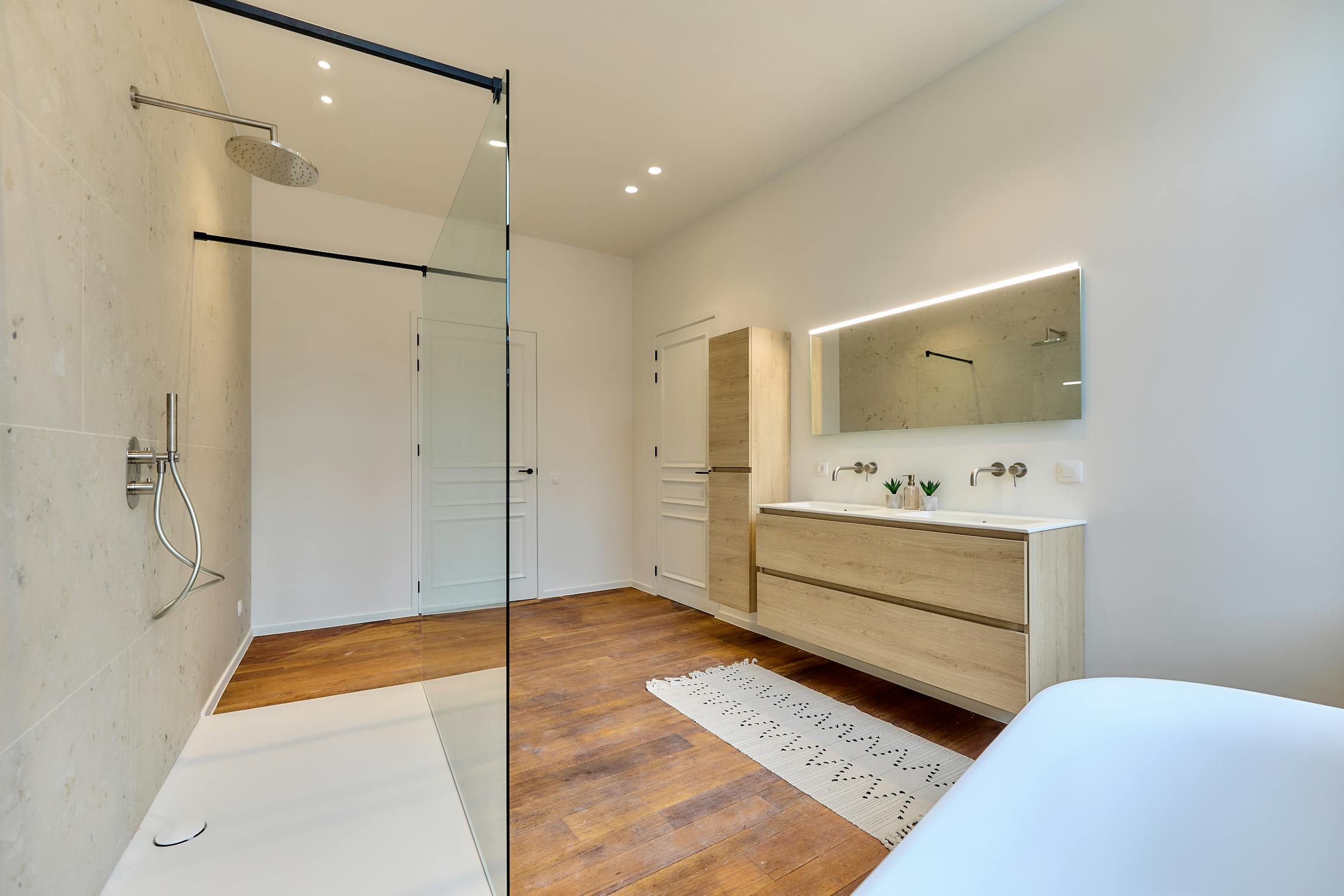 Eerste verdieping (bereikbaar met lift): Nachthal met apart toilet - master bedroom met verbinding naar het terras - dressing/bureaukamer - ruime badkamer met lavabomeubel, ligbad en inloopdouche.