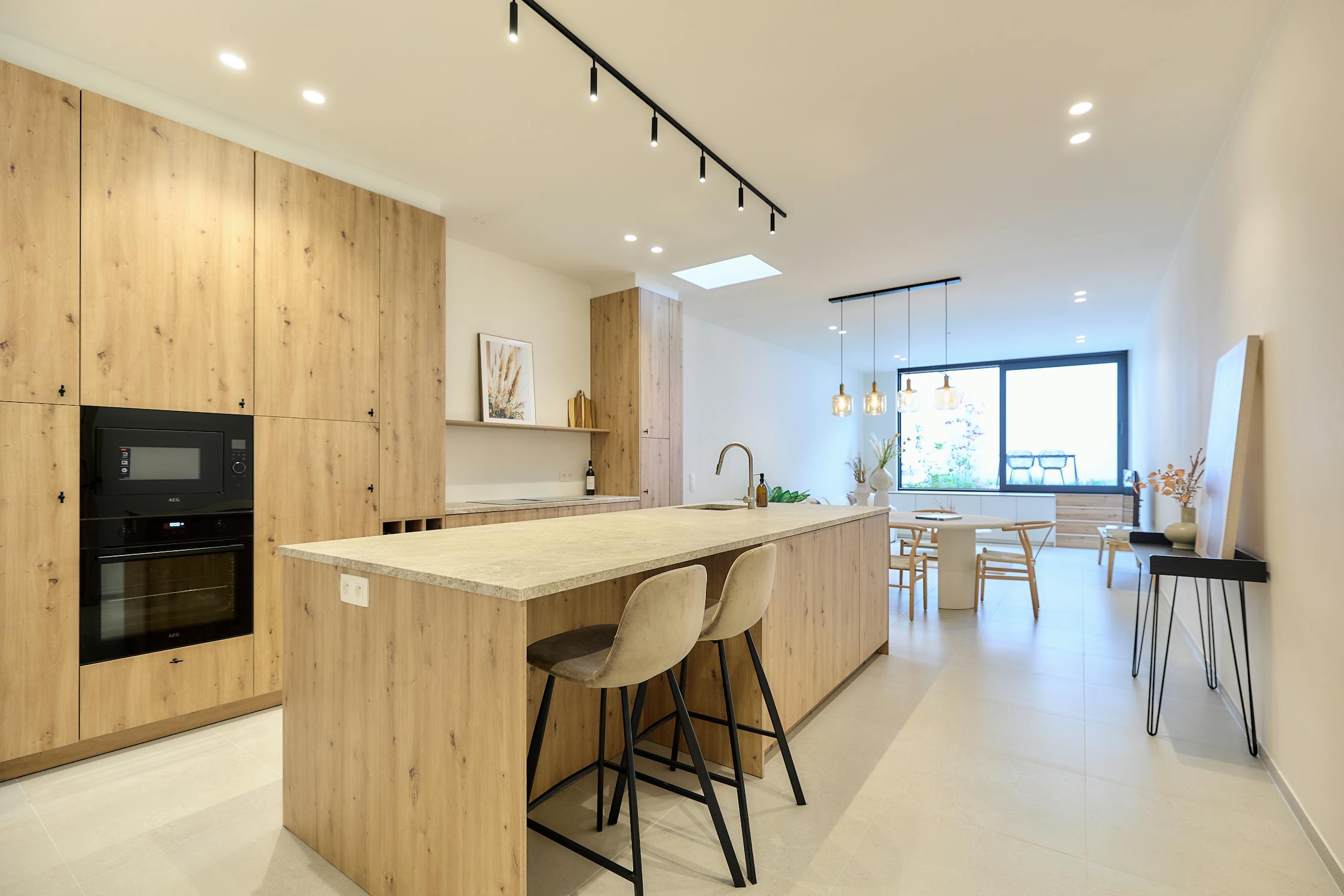 Gelijkvloers: Ruime inkomhal - gelijkvloerse kamer - lift - apart toilet - lichtrijke woonkamer met open keuken, voorzien van alle toestellen en eiland - berging naast de keuken - stadstuin met terras en trap naar het zonneterras op de eerste verdieping.
