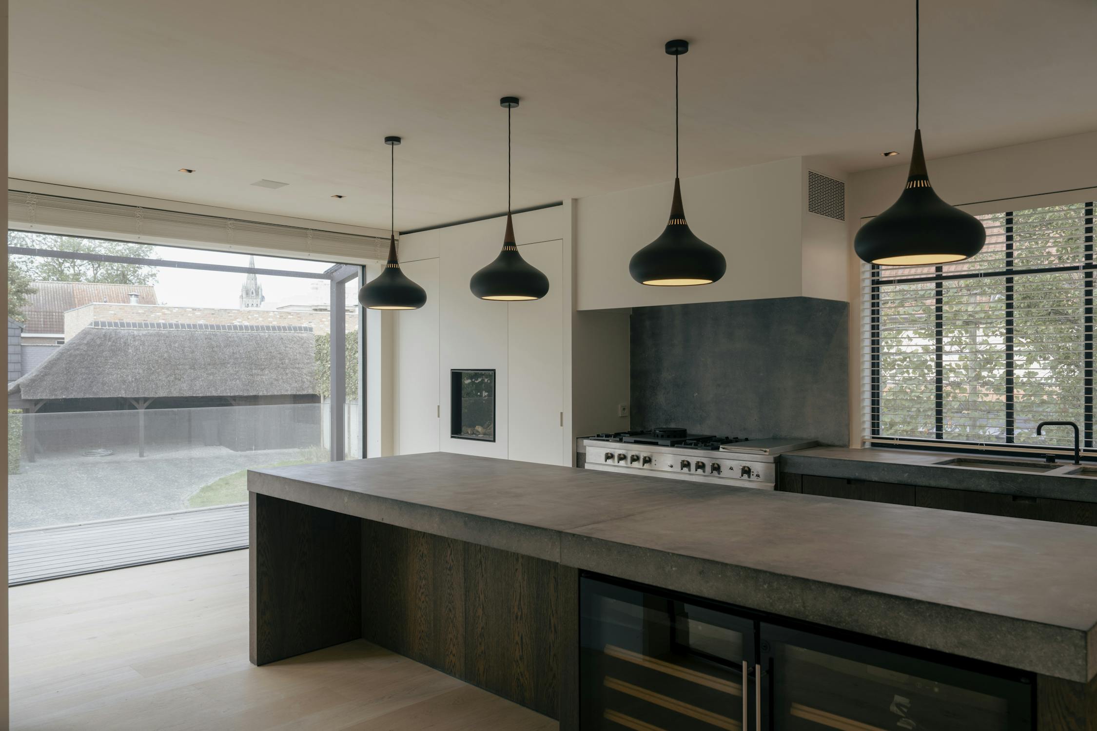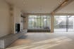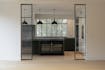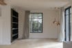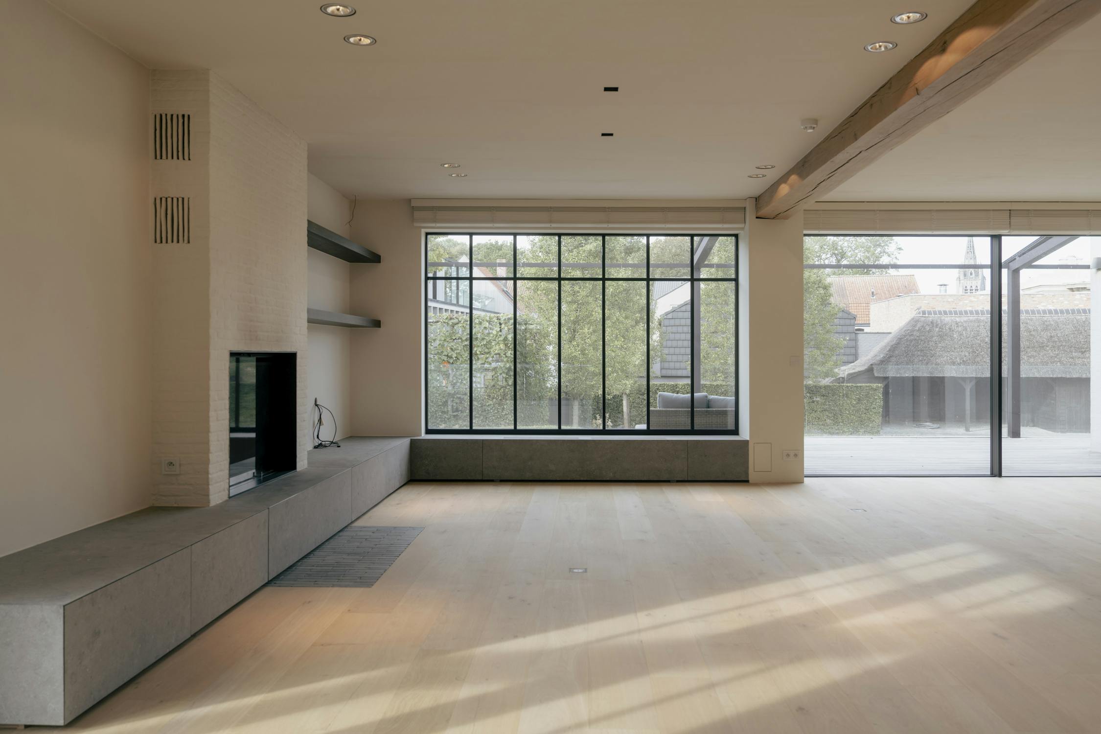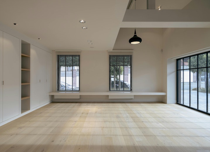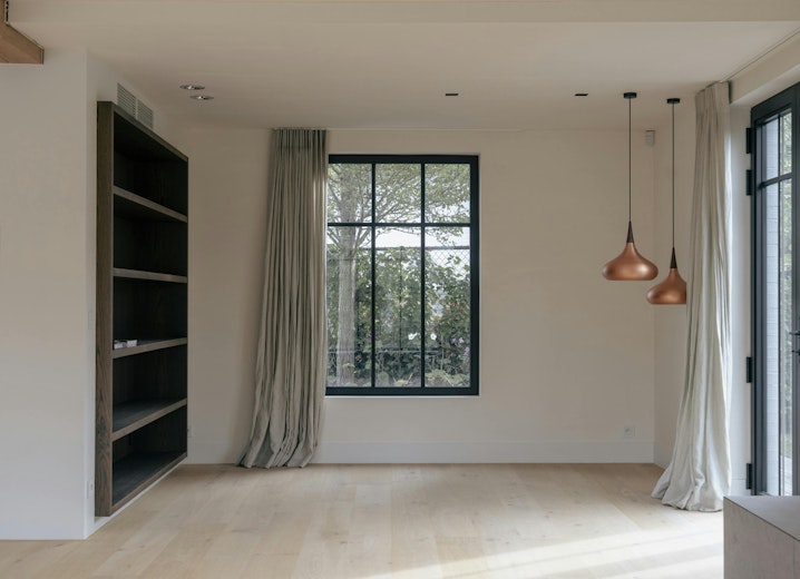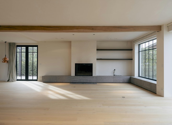 De woonkamer vormt het centrale ontmoetingspunt van de villa. Grote stalen raampartijen zorgen de hele dag voor een overvloed aan licht en een vloeiende verbinding met het terras en de tuin. Een strakke parketvloer, ingebouwde haard, zichtbare houten balken en naadloze maatwerkkasten creëren een interieur dat tegelijk warm en hypermodern aanvoelt. Dankzij de open indeling staan de keuken, de leefruimte en het aanpalende bureau op een natuurlijke manier met elkaar in contact.