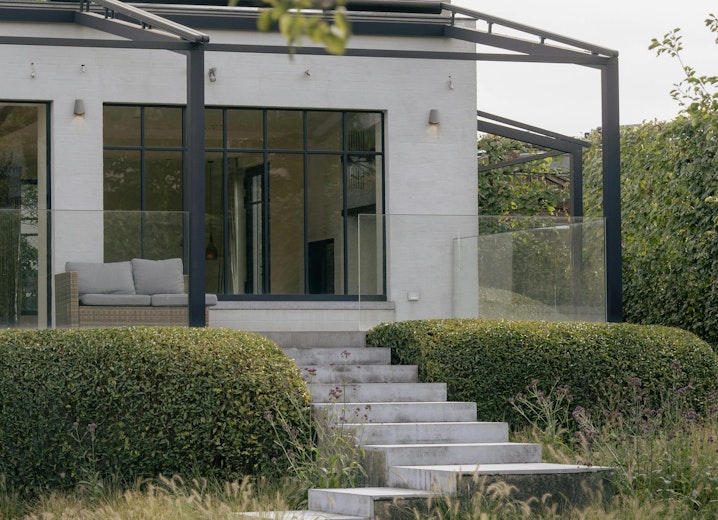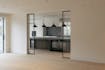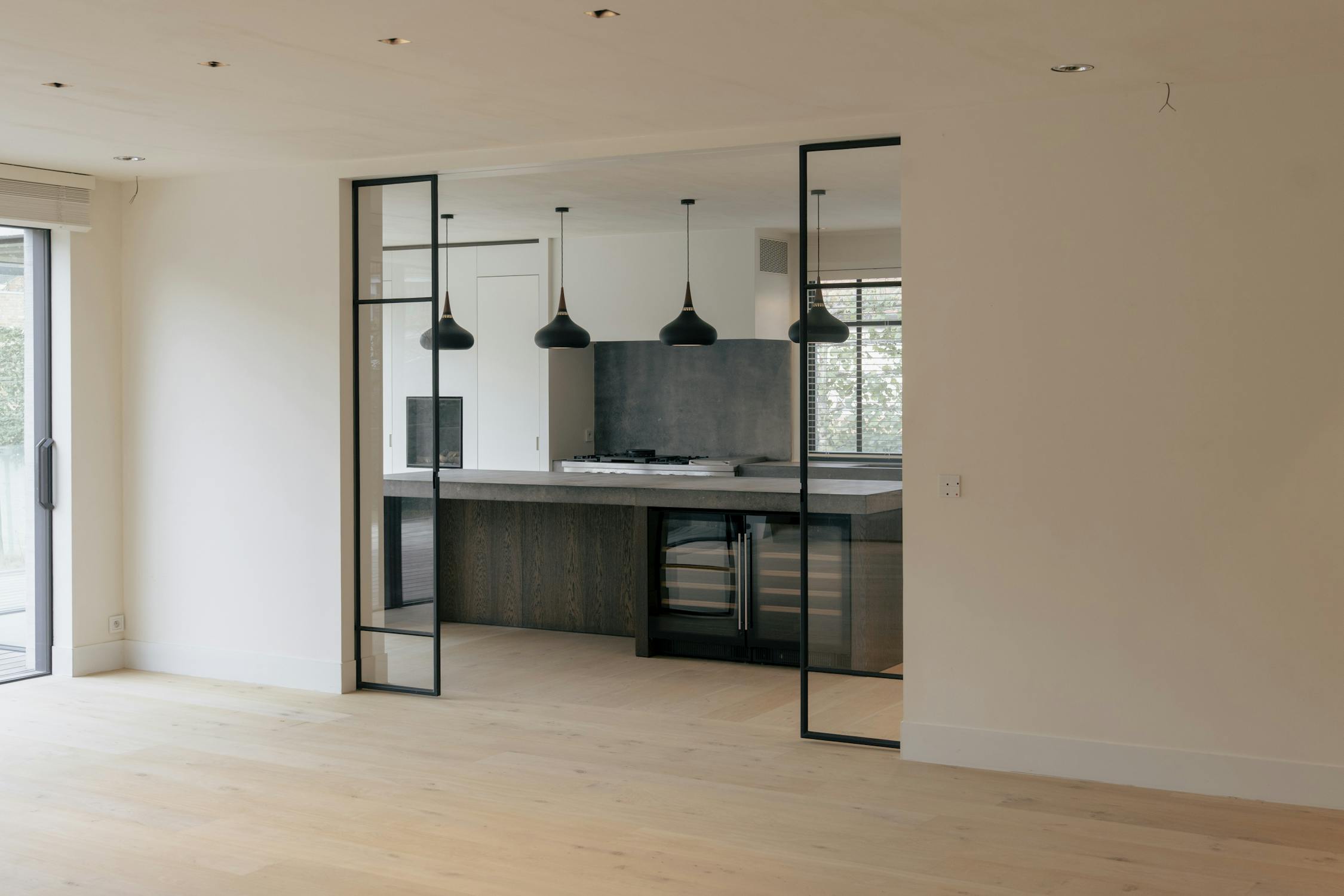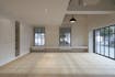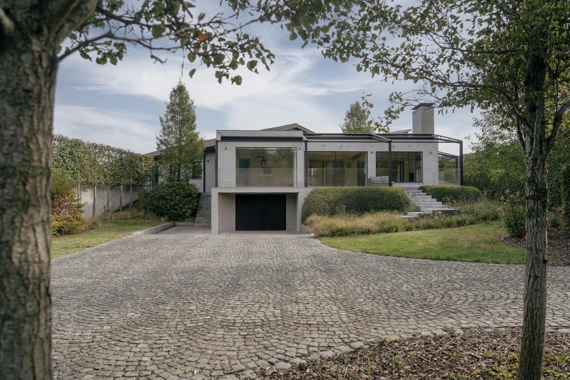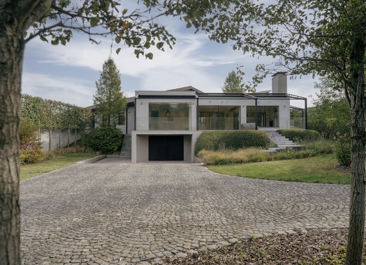De woonkamer vormt het centrale ontmoetingspunt van de villa. Grote stalen raampartijen zorgen de hele dag voor een overvloed aan licht en een vloeiende verbinding met het terras en de tuin. Een strakke parketvloer, ingebouwde haard, zichtbare houten balken en naadloze maatwerkkasten creëren een interieur dat tegelijk warm en hypermodern aanvoelt. Dankzij de open indeling staan de keuken, de leefruimte en het aanpalende bureau op een natuurlijke manier met elkaar in contact.