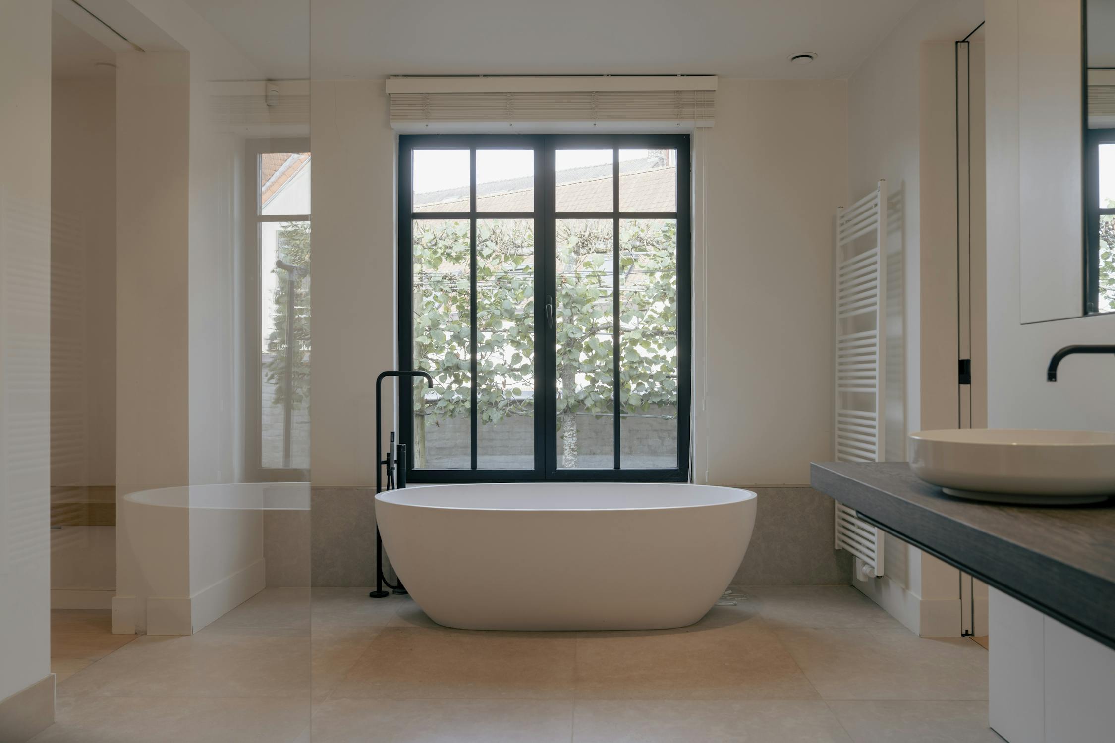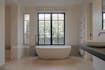 De riante badkamer is luxueus en doordacht ingericht: een ruime inloop-regendouche, een elegant vrijstaand ligbad, dubbel zwevend wastafelmeubel en toilet vormen samen een harmonieus geheel afgewerkt met hoogwaardige materialen en een rustgevend kleurenpalet.