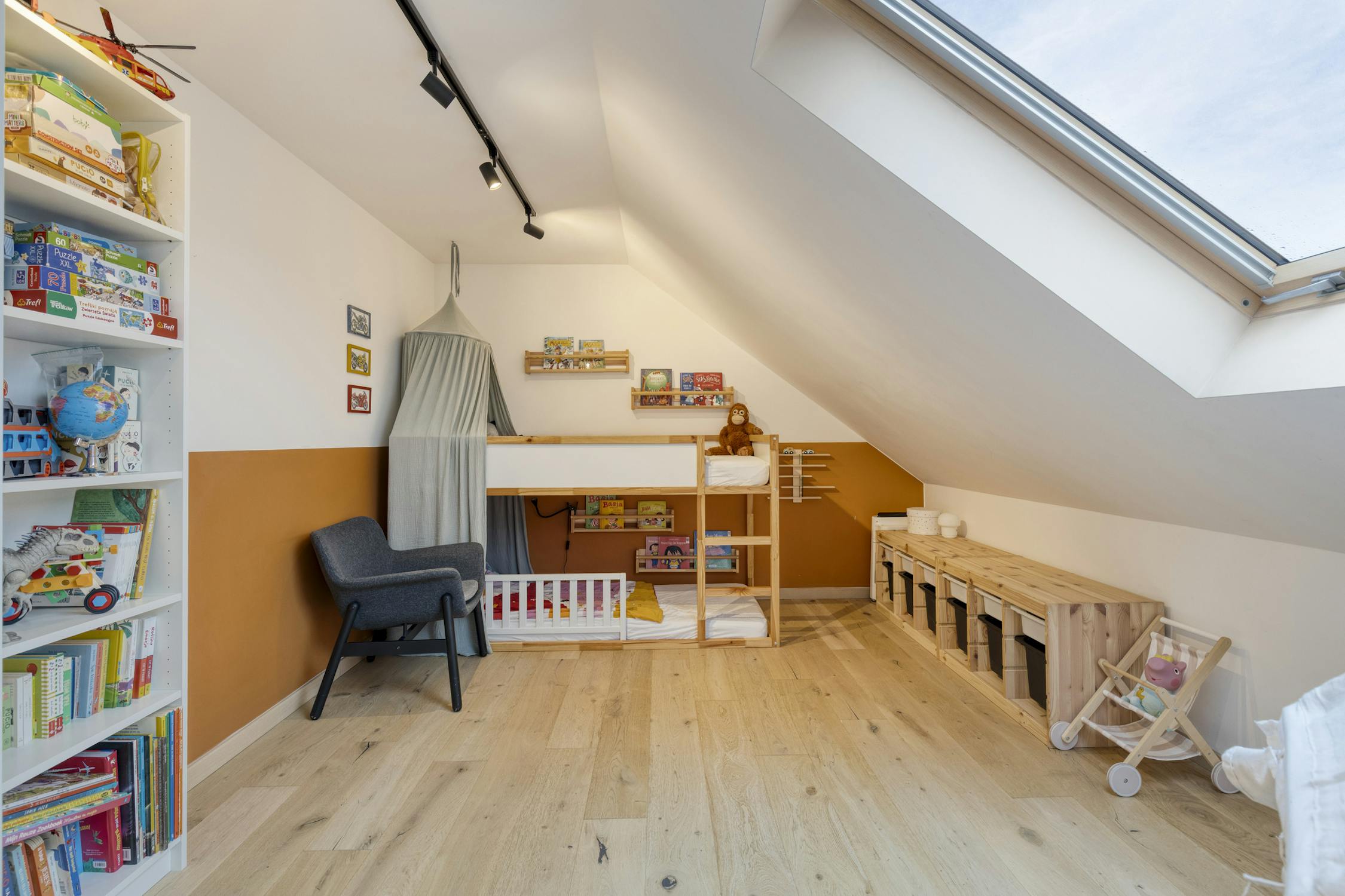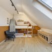 De zolderruimte is boven de garage en te bereiken via een trapluik. Deze geeft extra bergruimte of kan zelfs een 5de slaapkamer worden die ook vanuit de 1ste verdieping bereikbaar is.