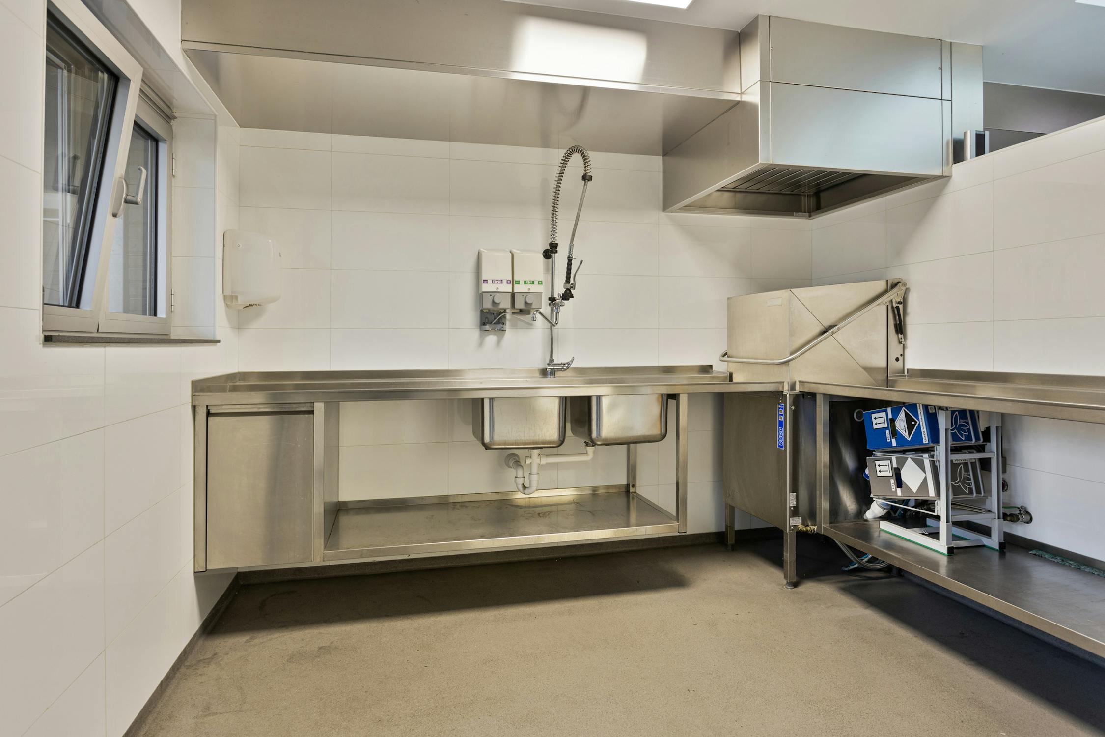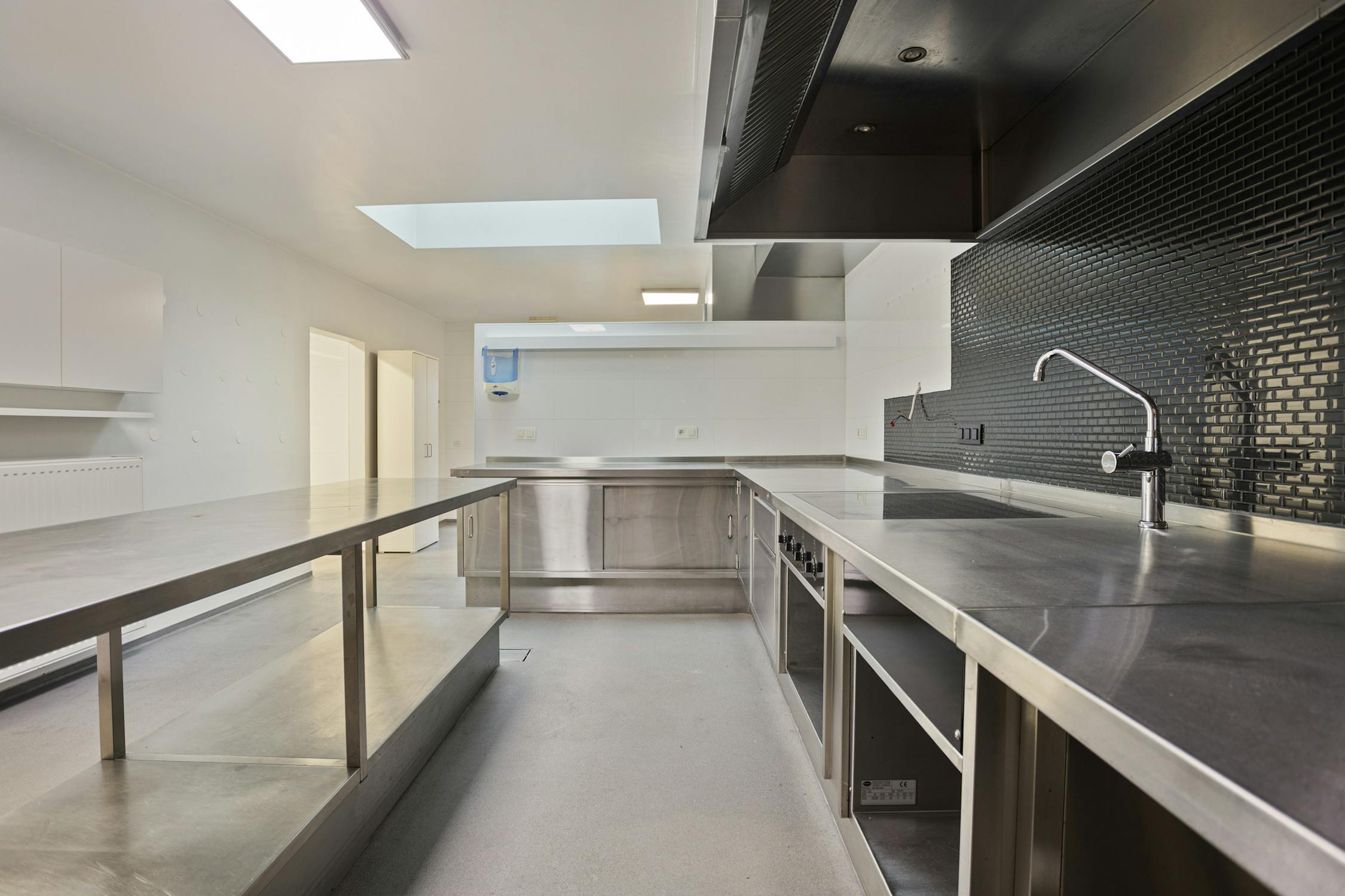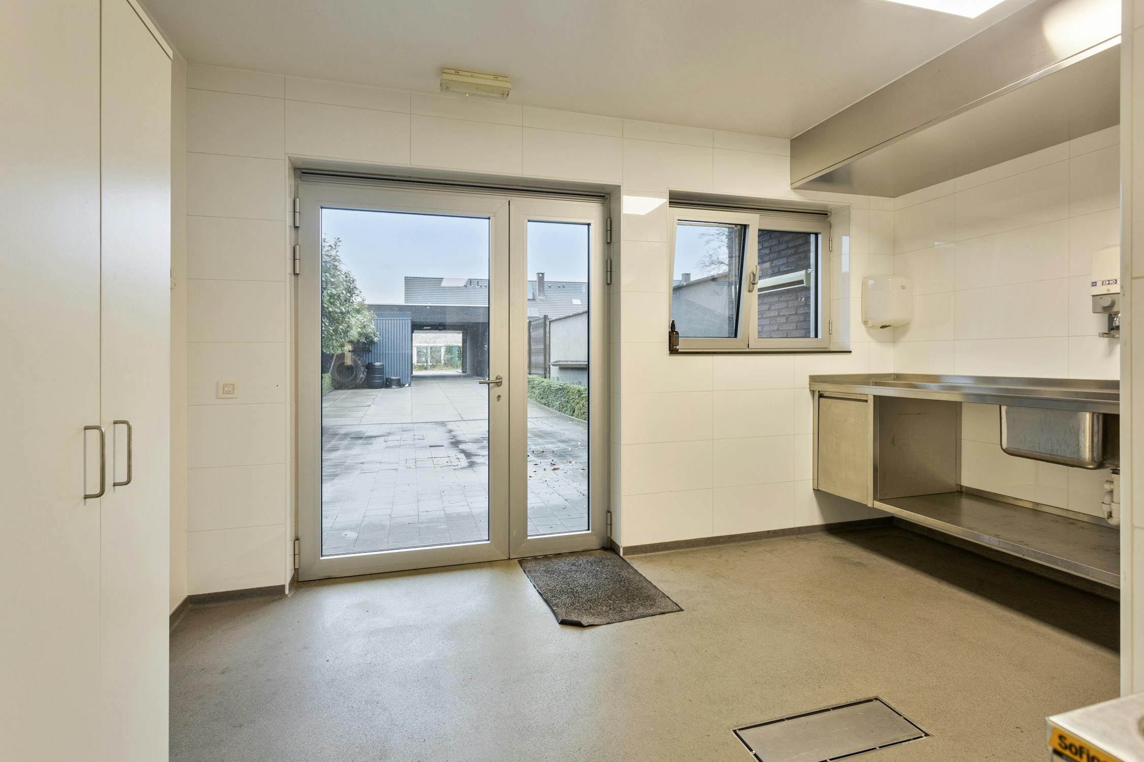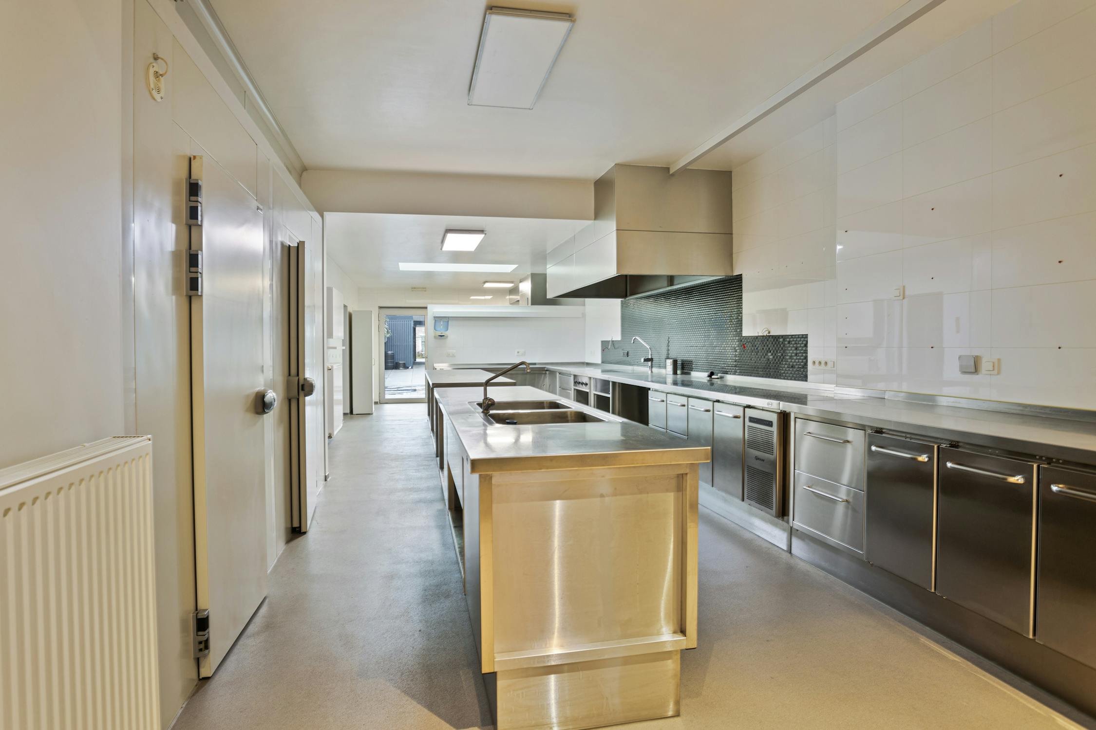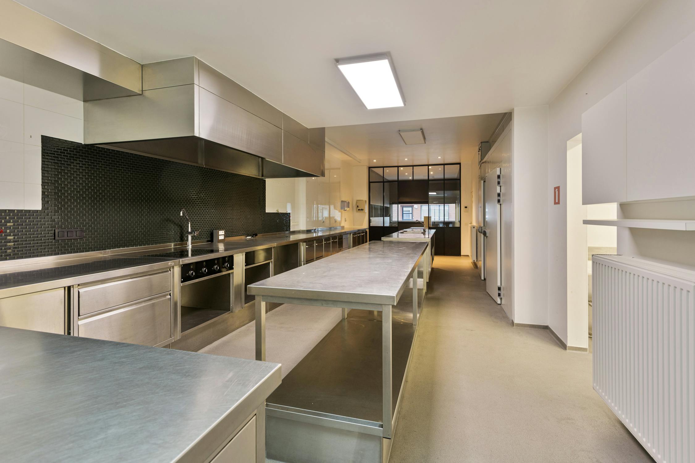 Het gelijkvloers heeft centrale verwarming, toegangscontrole, koelruimten en HACCP-vloerafwerking. De huidige keukeninrichting kan behouden blijven of verwijderd worden.