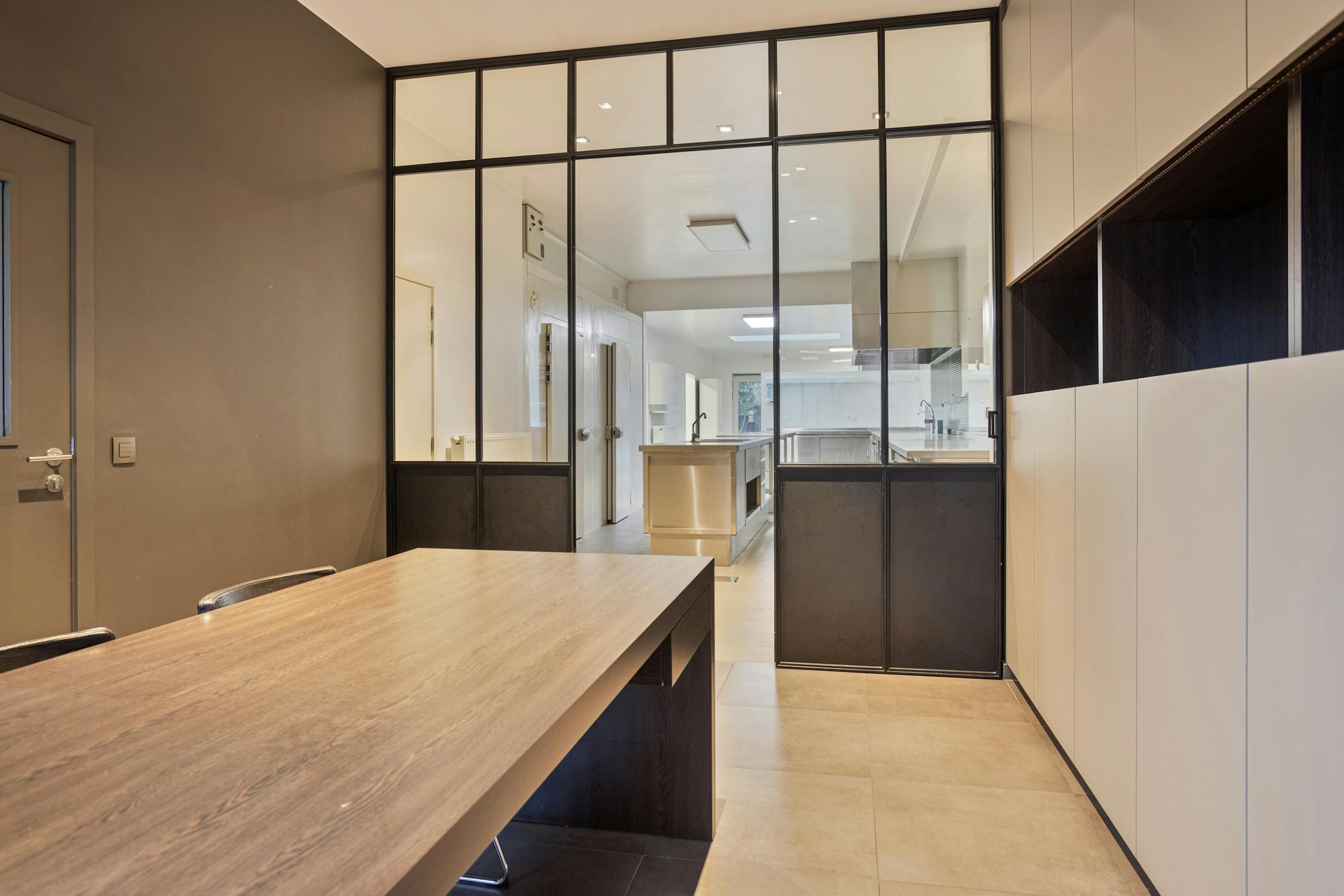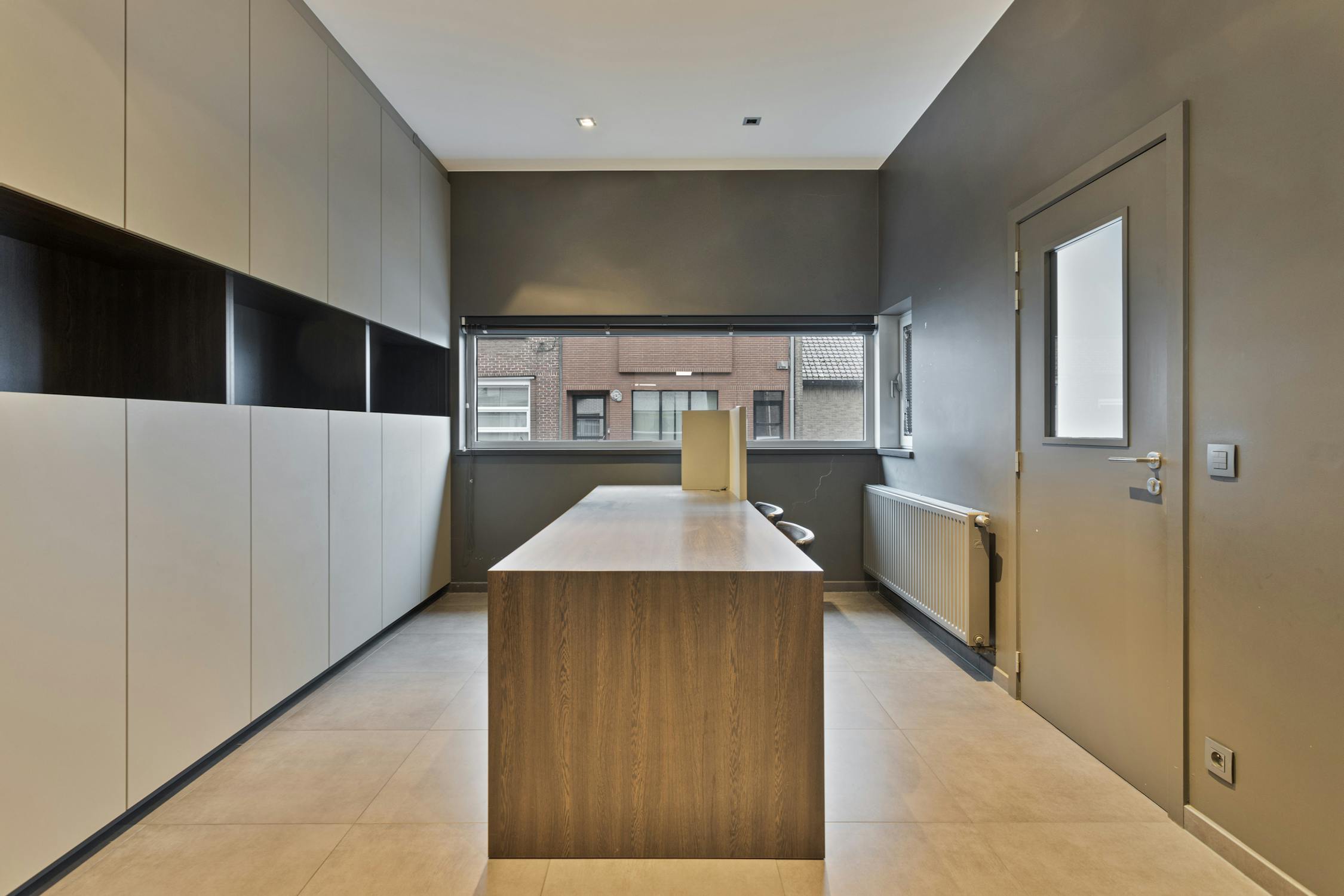 Via de gemeenschappelijke inkomhal is er toegang tot een afzonderlijk ingericht bureau. Dit bureau biedt zicht op en toegang tot de polyvalente ruimte.