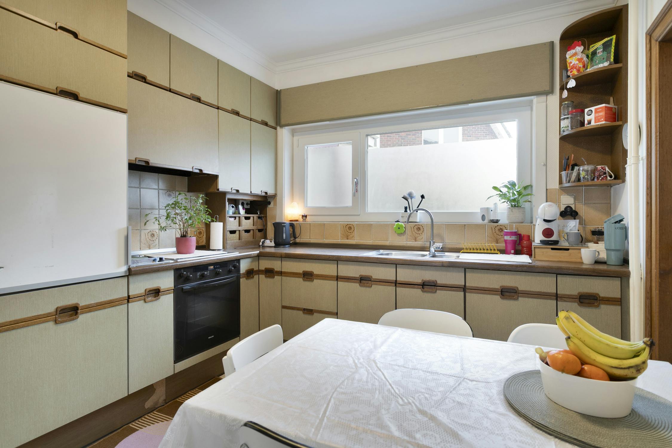 * keuken met frigo, oven en keramische kookplaat