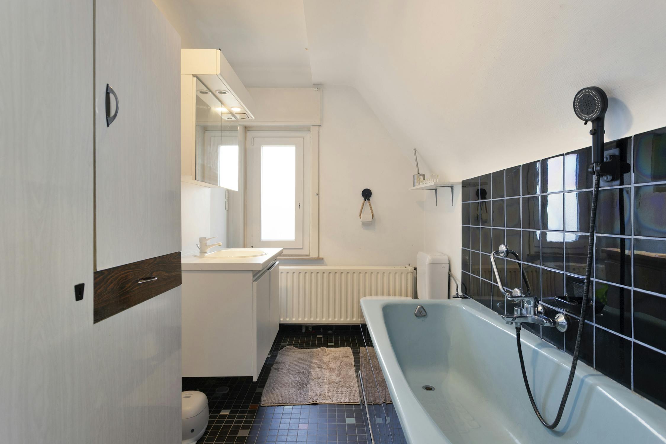 * badkamer met ligbad, toilet en lavabomeubel