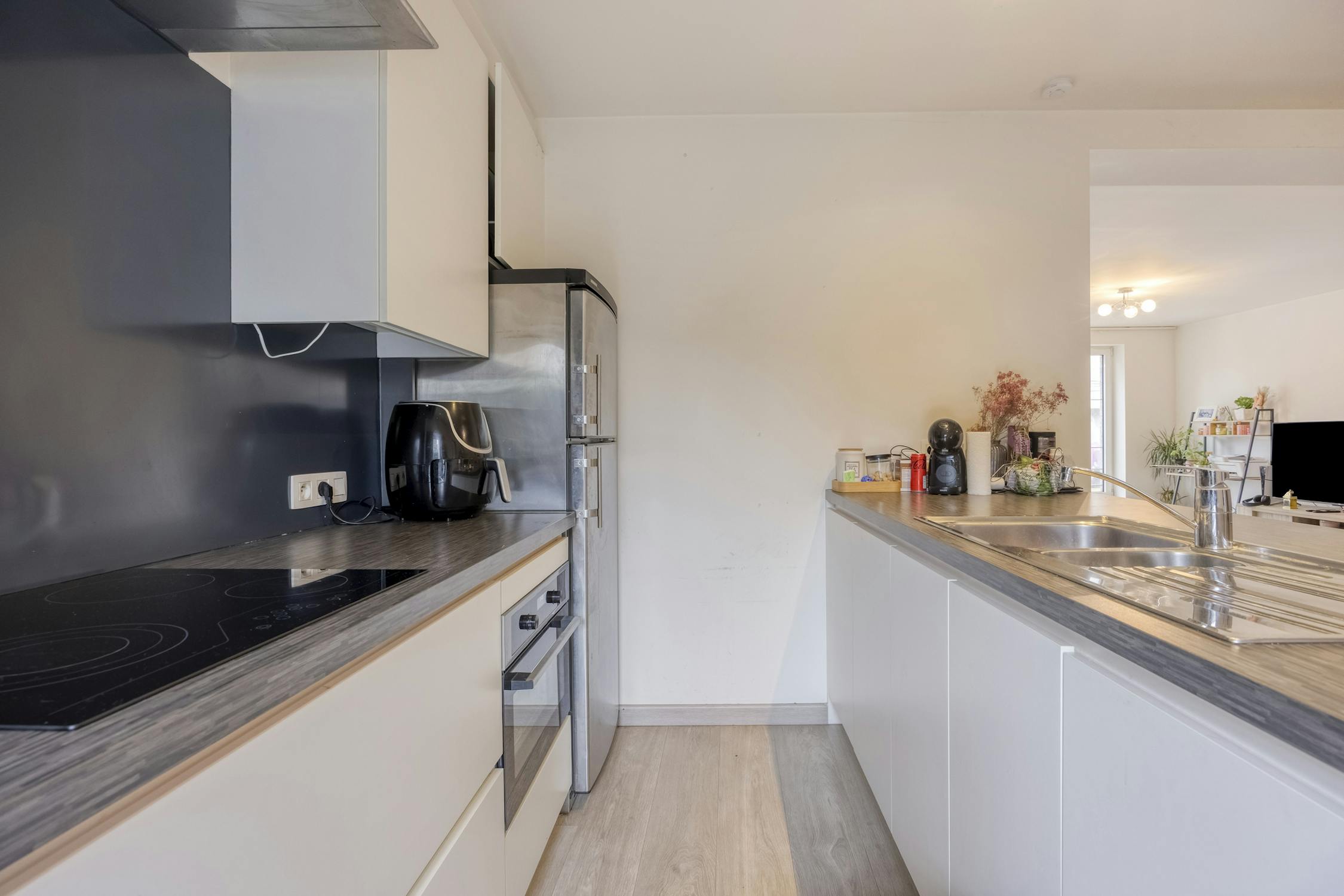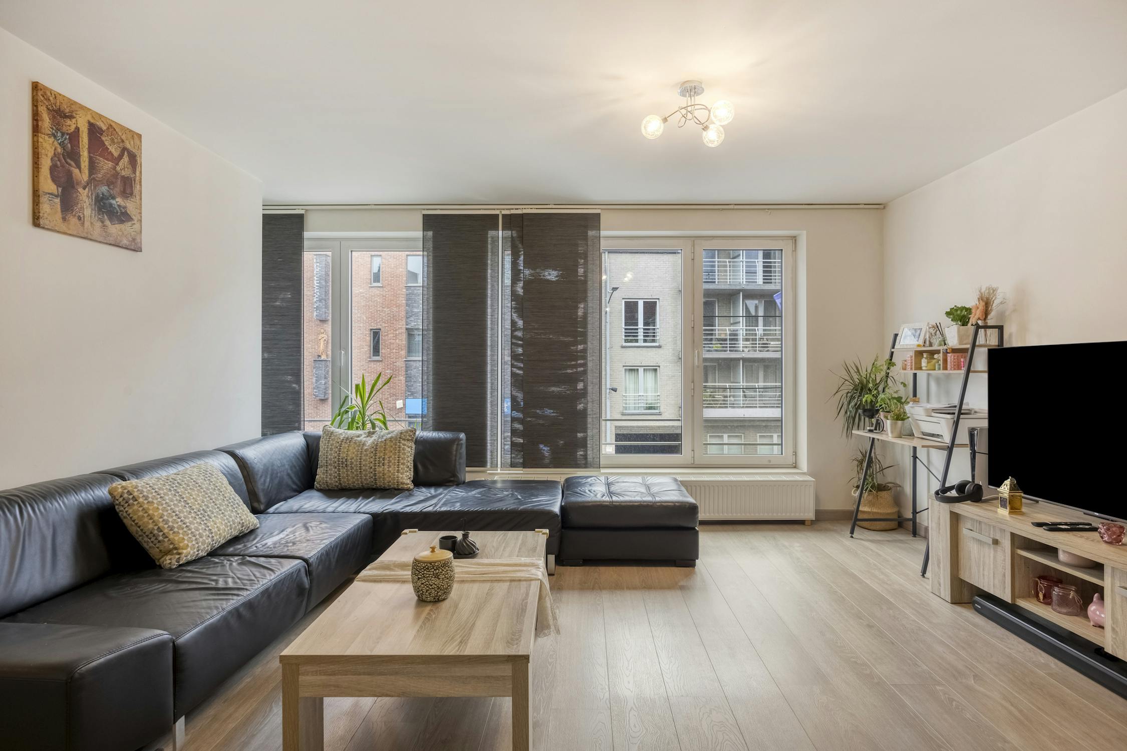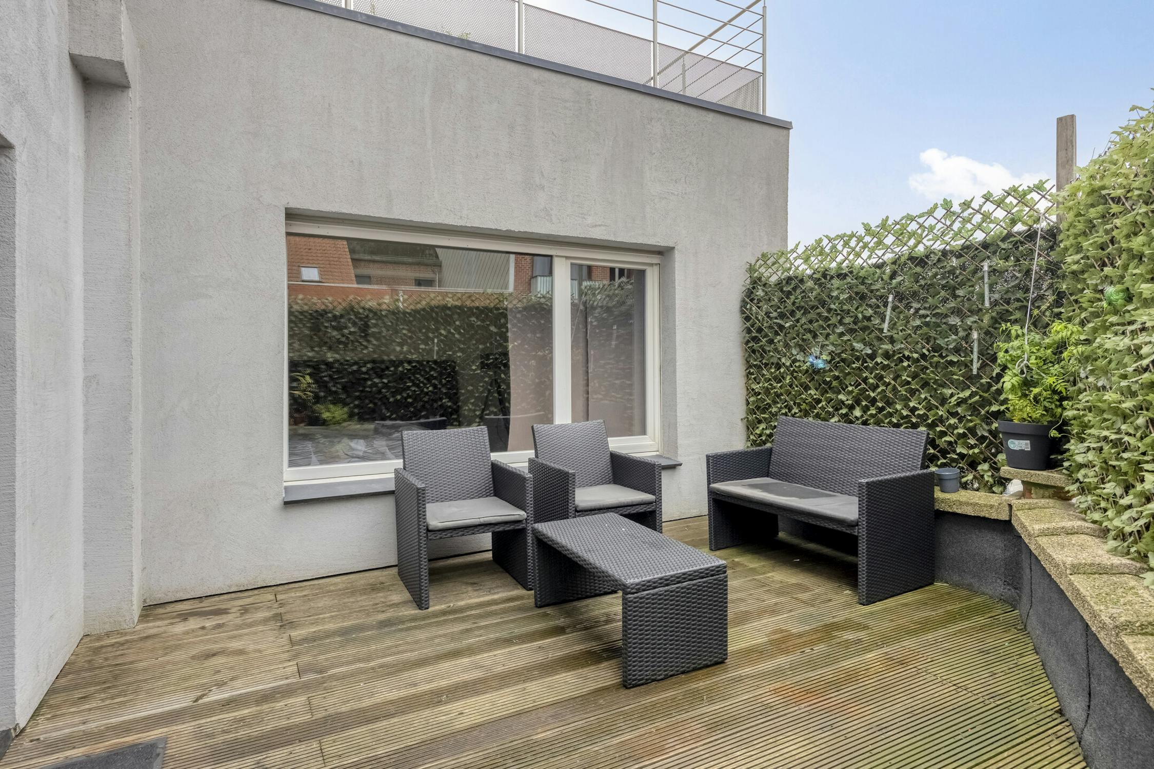 - 1e verdiep: Appartement (± 100 m²) met 2 slaapkamers en een zonnig terras van ± 10 m².
